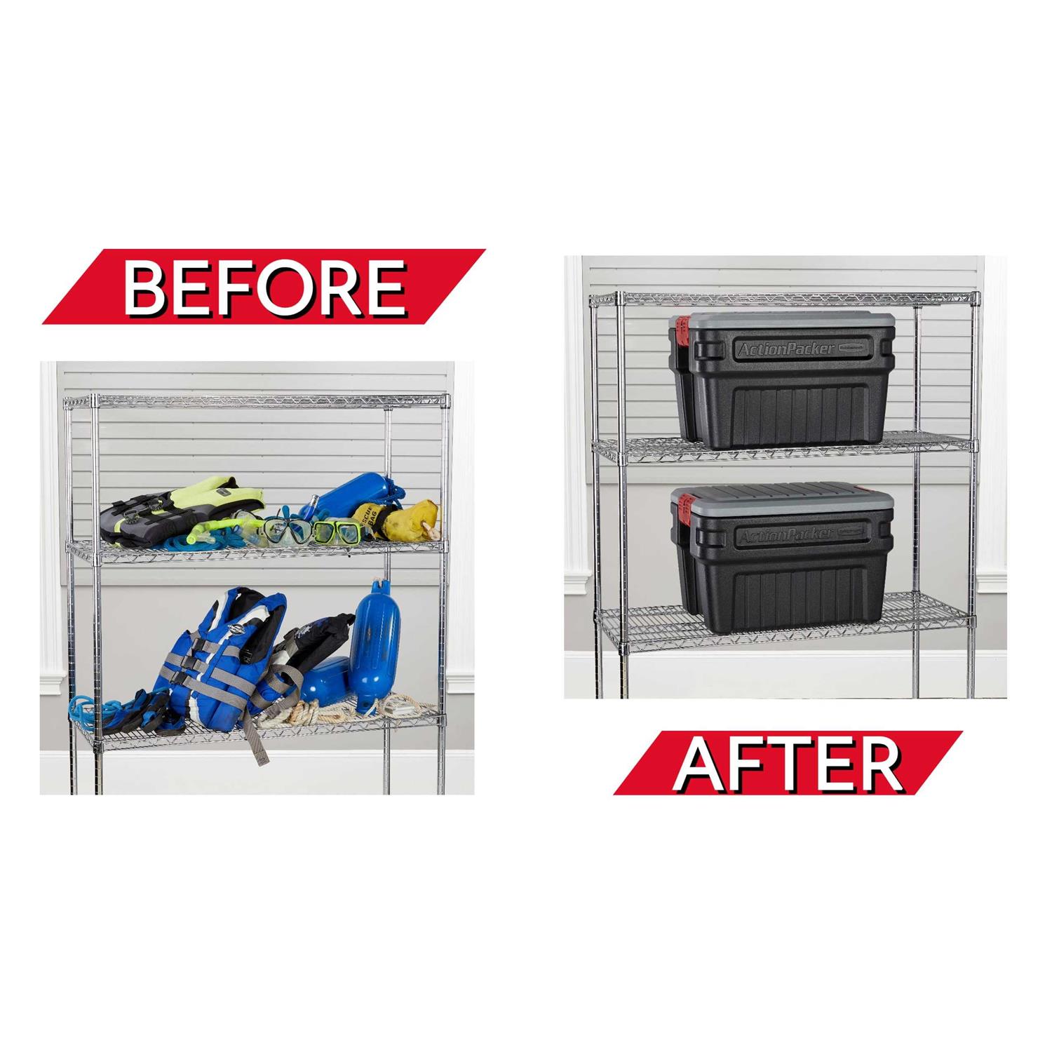 The Rubbermaid 24 Gallon ActionPacker Storage Bin is tough and can withstand everyday usage. This heavy duty storage tote is made of impact resistant material and can withstand temperatures of 0-100 F. Featuring a double-walled lid, this storage bin will keep all contents safe and dry and is designed to prevent water from pooling on the lid top. This container also is designed to accommodate a lock, adding extra security to your contents. This storage container provides a storage solution for anything whether it be sports equipment, camping supplies, or even a tool chest.