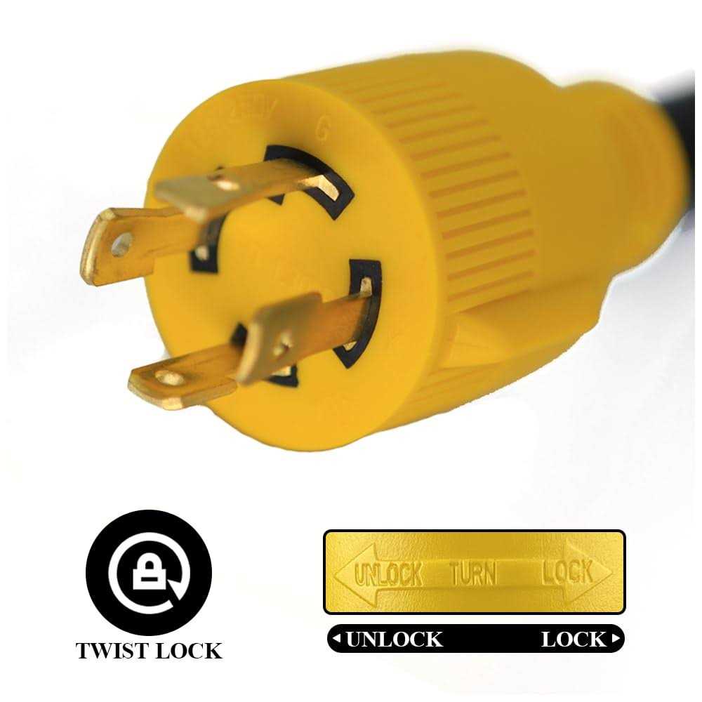 NEMA L14-30P to 14-50RRated value:30A/125V/3750W12″ length adapter,100% copper wire conductor inside.Handle makes pluging and unpluging easier.It’s only used for connecting generator to RV,and do not exceed the rated power.