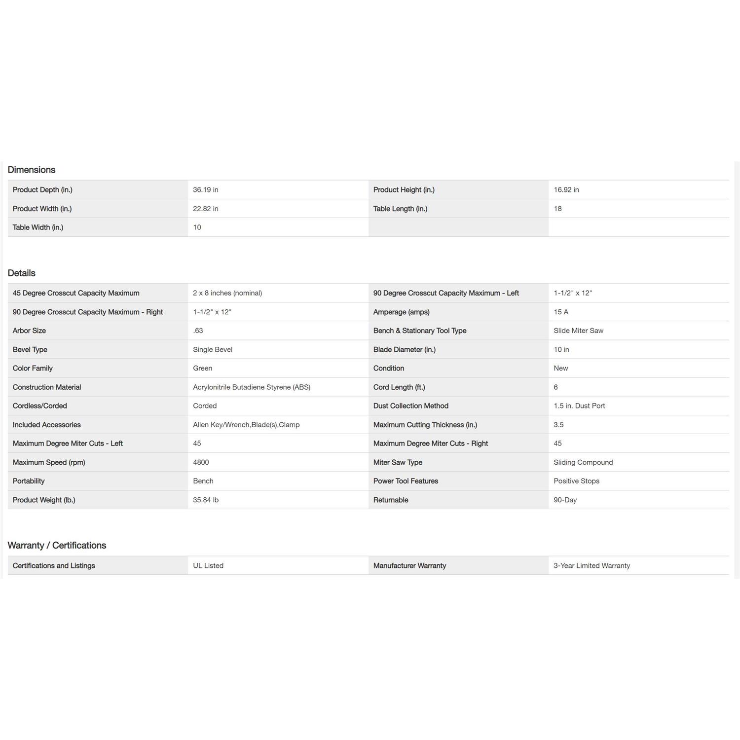 FEATURES: 10 in. Sliding Compound Miter Saw: Heavy duty 15 Amp motor to easily cut through larger material 10 in. Sliding Compound Miter Saw: Sliding head provides maximum capacity for up to 12 in. cross cut 10 in. Sliding Compound Miter Saw: Miter stops located at the most common crown molding angles: 0°, 15°, 22.5°, 31.6°, and 45° left and right for quick cut settings 10 in. Sliding Compound Miter Saw: LED Cutline Indicator and work-light projects cut line and illuminates material to improve accuracy of the cut and visibility 10 in. Sliding Compound Miter Saw: Miter Detent Override: Quick action lever bypasses miter detent index points with one simple motion 10 in. Sliding Compound Miter Saw: Machined cast-in miter scale for accurate table alignment 10 in. Sliding Compound Miter Saw: Electric brake stops the blade in seconds 10 in. Sliding Compound Miter Saw: Spindle lock for easy single wrench blade changes 10 in. Sliding Compound Miter Saw: Extended miter range from 47° left and right to accommodate a wide variety of cuts 10 in. Sliding Compound Miter Saw: Fixed Dust Port maintains the ideal position to optimize dust collection efficiencies for both plunge and sliding cuts 10 in. Sliding Compound Miter Saw: 1-1/4 in. dust port provides connection to standard dust collection systems to help keep work area clean 10 in. Sliding Compound Miter Saw: Horizontal D handle for improved comfort 10 in. Sliding Compound Miter Saw: Includes: (1) TSS103T Miter Saw with LED and 40-tooth carbide-tipped blade, table extensions, work clamp, blade wrench, dust bag, and operator’s manual 10 in. 40 Carbide Teeth Thin Kerf Miter Saw Blade: 40 Carbide reinforced teeth for extended cutting life 10 in. 40 Carbide Teeth Thin Kerf Miter Saw Blade: Includes: (1) A181002 10 in. 40 Carbide Teeth Thin Kerf Miter Saw Blade PRODUCT SPECIFICATIONS: Brand: Ryobi Arbor Size (in.): 5/8 in Blade Diameter (in.): 10 in Work Table Length (in.): 18 in Work Table Width (in.): 10 in Amperage (amps): 15 A Cord Length (ft.): 6 ft 10 in. Sliding Compound Miter Saw: Extended miter range from 47° left and right to accommodate a wide variety of cuts 10 in. See reviews of RYOBI TSS103-A181002 on Youtube Use and Care Manual