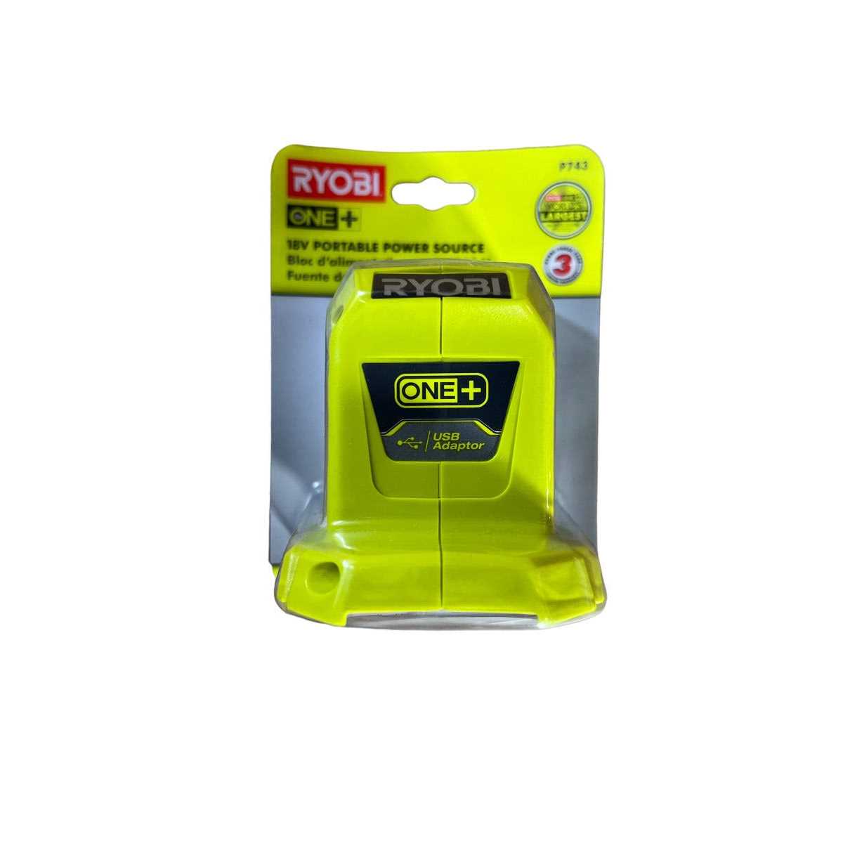 RYOBI introduces the 18V ONE+ Portable Power Source. The Portable Power Source snaps onto the top of all RYOBI 18V ONE+ Batteries so users can conveniently charge smart devices on the go. This compact power source provides two USB ports for simultaneous charging of smart devices without the hassle of finding an outlet. Best of all, it’s a part of the RYOBI ONE+ System of over 280 Cordless Products that all work on the same battery platform. the 18V ONE+ Portable Power Source includes an operator’s manual. Batteries and chargers sold separately. (2) USB ports for convenient and simultaneous charging including (1) 1 Amp port and (1) 2.1 Amp port Unit powers off after 8 hours of charging to conserve RYOBI battery life Conveniently charge your smart devices anywhere without the hassle of finding an outlet Compact so you can store in small spaces like toolboxes and bags Snaps onto the top of all RYOBI 18V Batteries for easy portability Includes: (1) P743 18V ONE+ Portable Power Source and operator’s manual Battery and charger sold separately