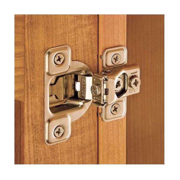 A self-closing hinge. 106 degree opening angle. 1/2 inch overlay. (13mm) 35mm bore diameter. 7/16 inch cup depth. For face frame applications only. Screw on application. Made of steel. 3-cam adjustment (height, depth, and side-to-side). Drilling distance of 3/32 inch (2.5mm). Includes 2 hinges and all mounting screws.