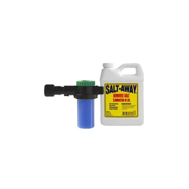 Salt-Away is a motor flush for inboard outboard I/O and personal watercraft motors and an exterior salt removing treatment. Salt-Away is water based non-hazardous biodegradable and contains properties that attack and remove salt from any surface. Repeated use with Salt-Away will break down and remove old salt and rust deposits. Safe for use on any metal aluminum fiberglass paint rubber plastic chrome glass or any surface exposed to salt. Salt-Away will not strip away waxes but will wash away salt and leave a protective film on the surface to protect against rusting.