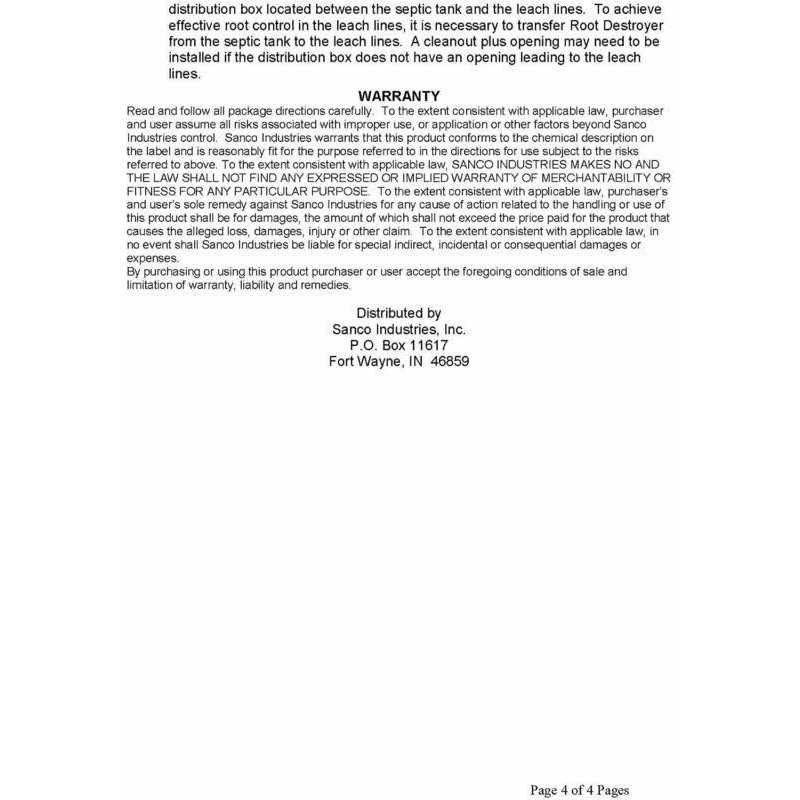 Made up of copper sulfate crystals that will kill invasive septic and sewer pipe roots without harming your tree. Made up of copper sulfate crystals that will kill invasive septic and sewer pipe roots without harming your tree. Root Destroyer will temporarily reduce bacterial action, but will return to normal approximately 15 days after treatment. Only roots inside the leach line will be killed. Do not apply through sink or tub drains. Use Root Destroyer at the rate of 2 lb. in an active 300 gallon septic tank 2 twice a year or anytime you have reduced water flow thought to be caused by root growth occurs. In 1/2 lb. increments, pour Root Destroyer into the toilet bowl nearest the sewer line and flush; repeat this process until the recommended dose has been added. Made up of copper sulfate crystals that will kill invasive septic and sewer pipe roots without harming your tree. Root Destroyer will temporarily reduce bacterial action, but will return to normal approximately 15 days after treatment. Only roots inside the leach line will be killed.