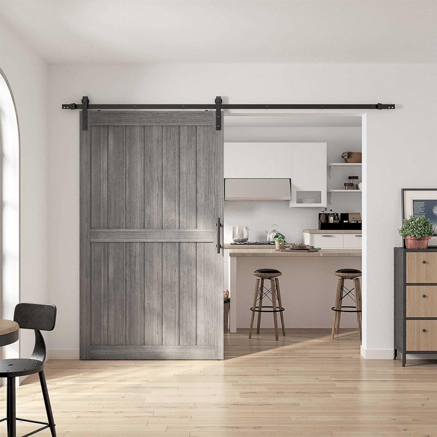 Sanding 48 in. x 84 in. MDF Sliding Barn Door with Hardware Kit, Covered with Water-proof PVC Surface, Gray, H-Frame