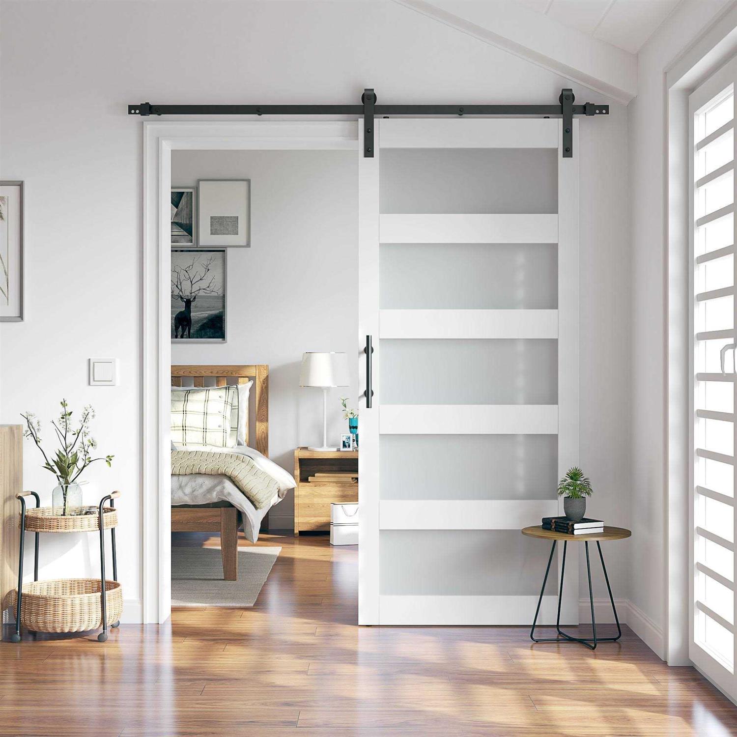 Sanding 36 in. x 84 in. 5 Frosted Glass White PVC Surface MDF Sliding Barn Door with Hardware Kit