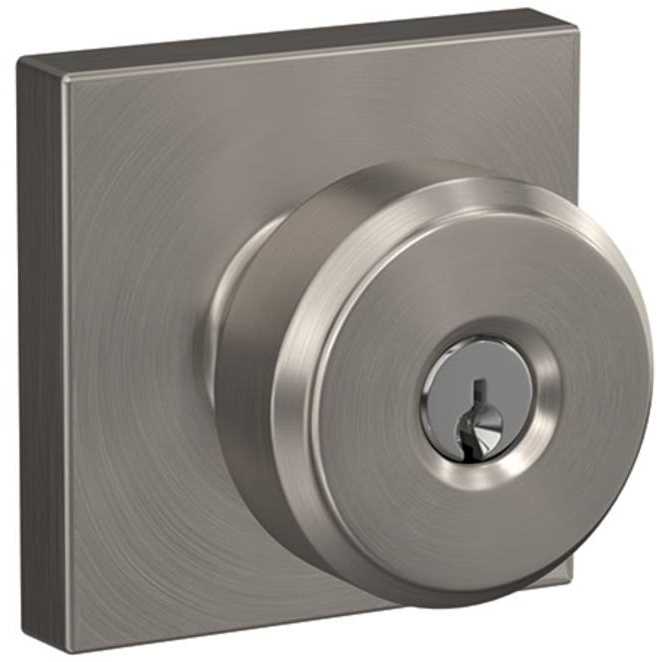 The Schlage Bowery Knob with Collins Trim Keyed Entry Lock in Satin Nickel is perfect for use on entry doors where keyed locking is needed. The Bowery knobs clean lines and minimalist design give it a futuristic look that is as modern as it is stylish, Collins trims strong lines and square shape embody refined elegance especially when wrapped in our versatile Satin Nickel finish. Plus, its been designed and tested with strength and durability in mind.