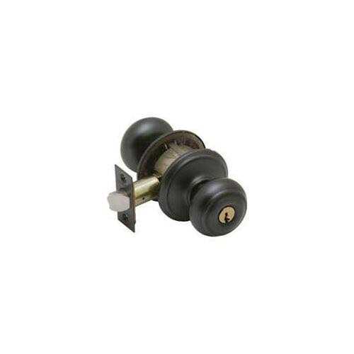 Entry knob locksets visual pack triple option universal deadlatch finish=aged bronze keying=k4 For residential single and multi-family entrance doors. Unlocked or locked by keyed knob outside or turnbutton knob inside; emergency exit feature, no unlocking required for panic exit, inside knob always unlocked. 1 piece knob for increased security. Solid brass trim and all metal parts. Wrought brass exposed trim. Pressure cast zinc tubular lock housing. Key removable outside knob for easy cylinder replacement.