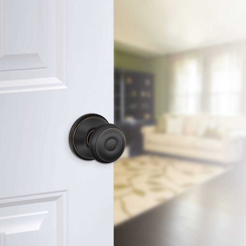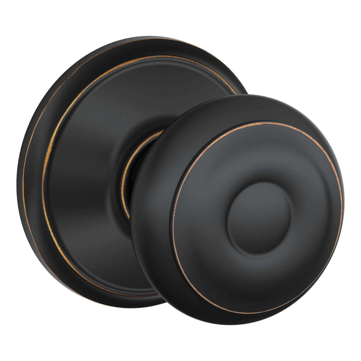 The Schlage Georgian Aged Bronze Passage Knob is perfect for use on hall and closet doors where locking is not needed. The Georgian knob’s design is inspired by Georgian-style homes in New England. Its symmetrical detailing is highlighted by our Aged Bronze finish featuring warm, copper tones that break through its darker, aged exterior. Plus, it’s been designed and tested with strength and durability in mind.