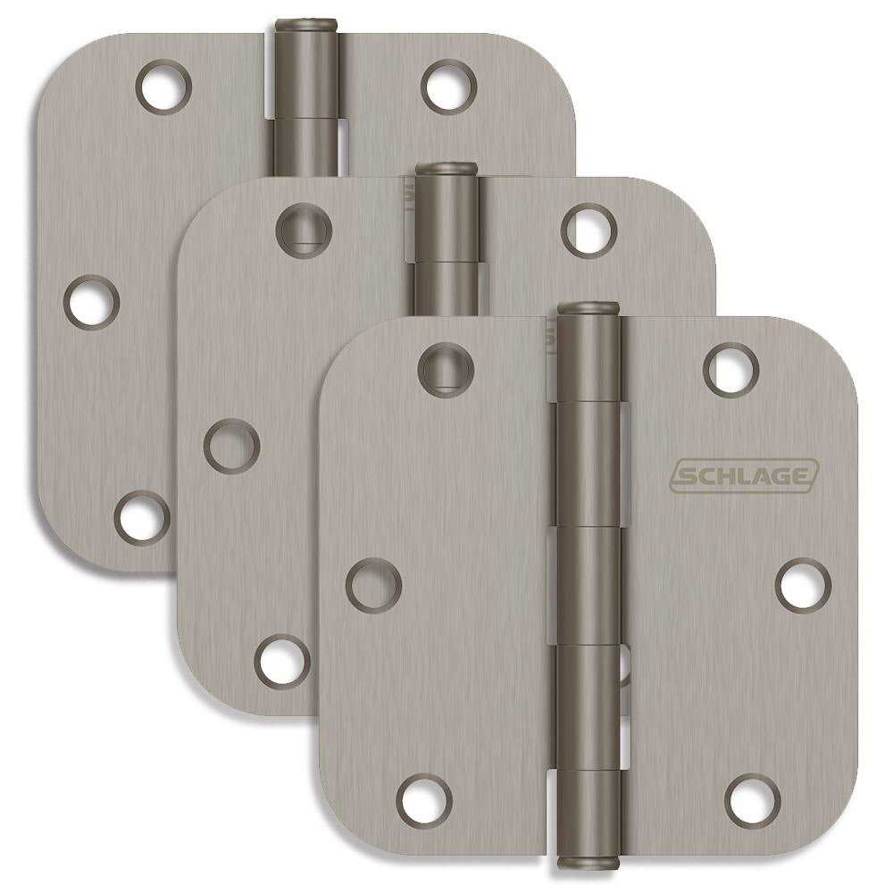 Schlage door hinges can only be purchased in packs of three. Coordinating with Schlage locks and builders hardware, these hinges feature a durable steel construction and lubricated knuckles that prevent binding. Features: Includes three (3) hinges in each order (cannot be sold individually) Steel construction for lasting durability Features 5/8″ radius corners Tested for residential strength application, ideal for your home Plain bearing hinge with removable pin Packaged with wood screws for quick installation Constructed with 6 screw holes in an arc hole pattern arrangement Product Technologies: Plain Bearing Hinge: Plain bearing hinges feature knuckles that are machined to a smooth surface, allowing them to move against one another without bearings. Plain bearing hinges are not recommended for heavy use on high traffic entrance ways, but meet the need of a standard residential door. Material- Steel: Steel is strong and durable, making it a favorite for hinges of all types. Though it is more prone to rusting than solid brass or stainless steel, it’s a great option for all residential applications. Mounting: The standard corners for mortised door hinges are 1/4″ radius, 5/8″ radius and square corner. It is recommended that three hinges be used on doors up to and including 7.5 feet with one additional hinge for each additional 2.5 feet. Make sure you check your current hinges before making a purchase. Specifications: Height: 3.5″ Width: 3.5″ Material: Steel Mount: Mortise Gauge(Thickness of Hinge Steel): 0.085″ Number of Knuckles: 5 Number of Screw Holes: 6 3-1/2″ x 3-1/2″ hinge with 5/8″ radius corner Removable pin Coordinates with Schlage locks and builders’ hardware and features a durable steel construction and lubricated knuckles that prevent binding Schlage has been creating quality building hardware for over 100 years