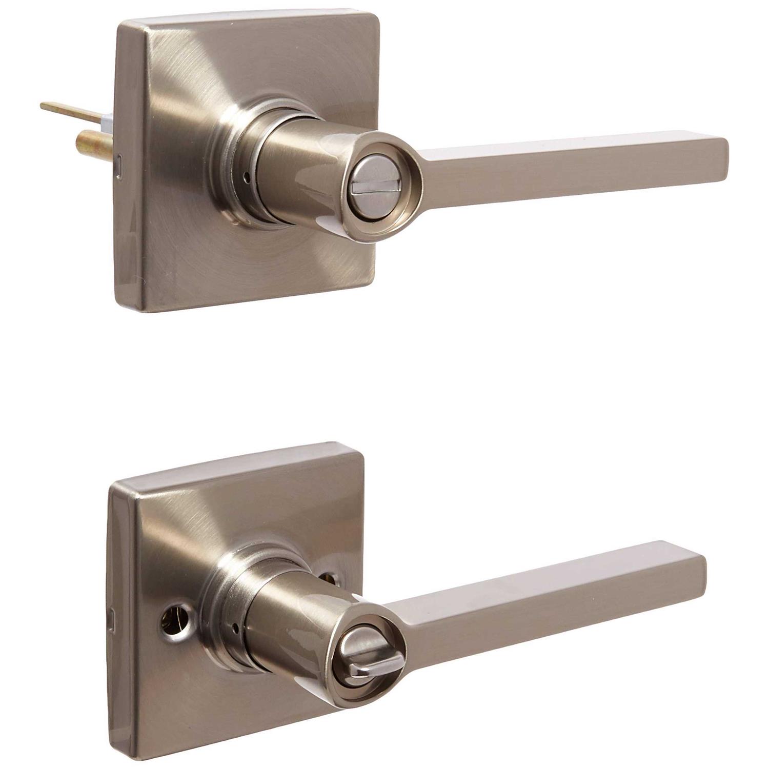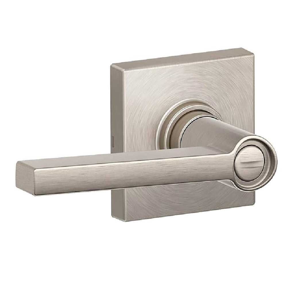 The Schlage J Series solstice lever with collins trim bed and bath lock is perfect for use on bedroom and bathroom doors where locking is needed. The solstice lever offers simple sophistication, with crisp design lines and a structured rectangular look perfect for modern, urban spaces, while the collins trim’s strong lines and square shape embody refined elegance. Plus, it’s been designed and tested with strength and durability in mind.