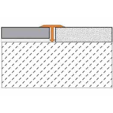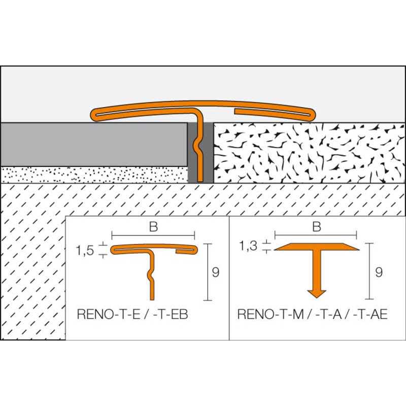 Reno-T is designed for transitions between hard surface floor coverings that are the same-height. It can be used to retrofit an existing installation or can be installed during the tile installation. Reno-T overlaps the edges of the floor coverings to protect the edges against damage. Installation is quick and easy by filling the joint between the floor coverings with an elastomeric sealant, like Schluter-Kerdi-Fix and pressing the profile into the joint.