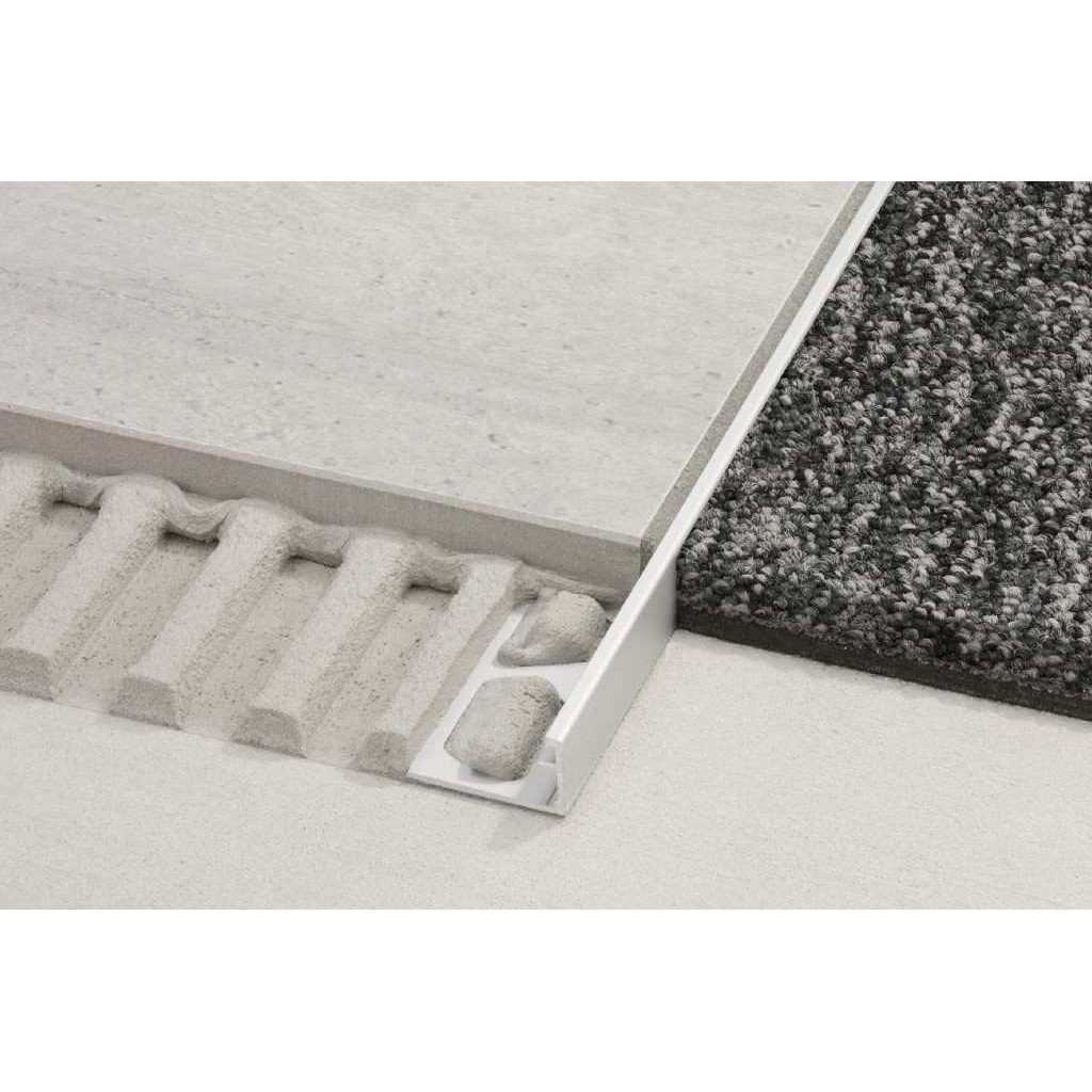 The Schiene profile is designed to finish and protect tile edges on floors and walls. It is ideal for creating floor transitions between tile and another surface of the same height such as carpet or wood. Schiene has an integrated joint spacer which ensures a uniform grout joint between the tile and profile.