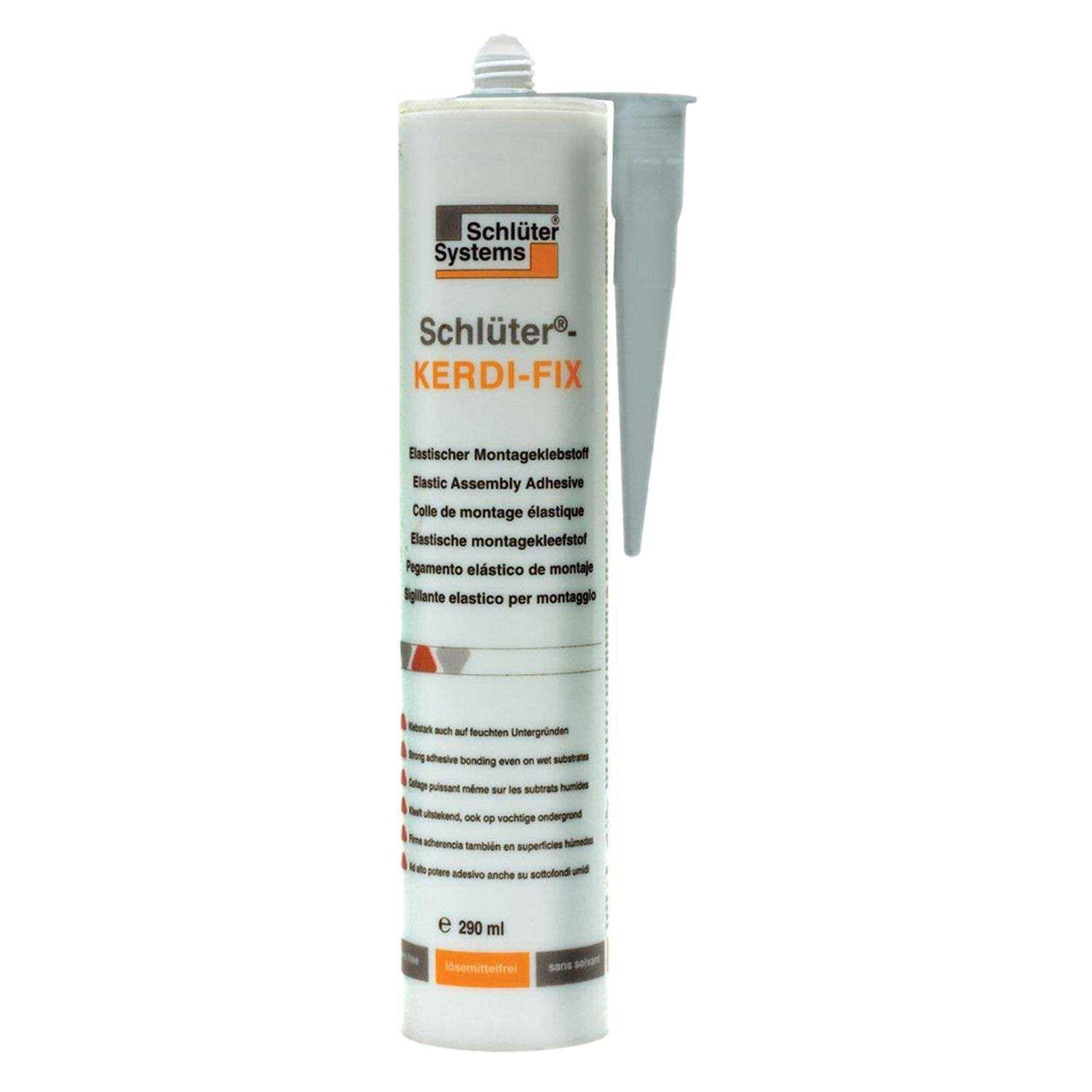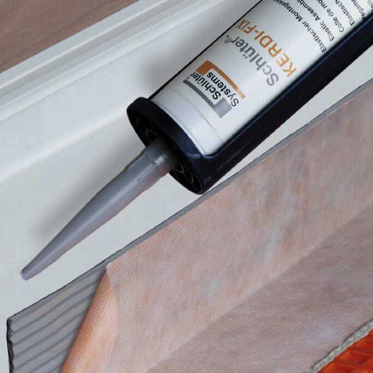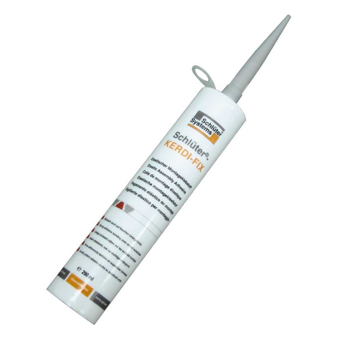 Schluter-KERDI-FIX is a single-component bonding compound. It is superior to standard caulk as it is odor-neutral, resistant to UV rays and acclimate weather, and contains no solvents that could corrode other building materials. It affixes well to most building materials, including wood, stone, concrete, metal, and glass. It bonds suitably to Schluter-KERDI waterproofing membrane as well, making it the ideal sealing compound for shower and bath construction.