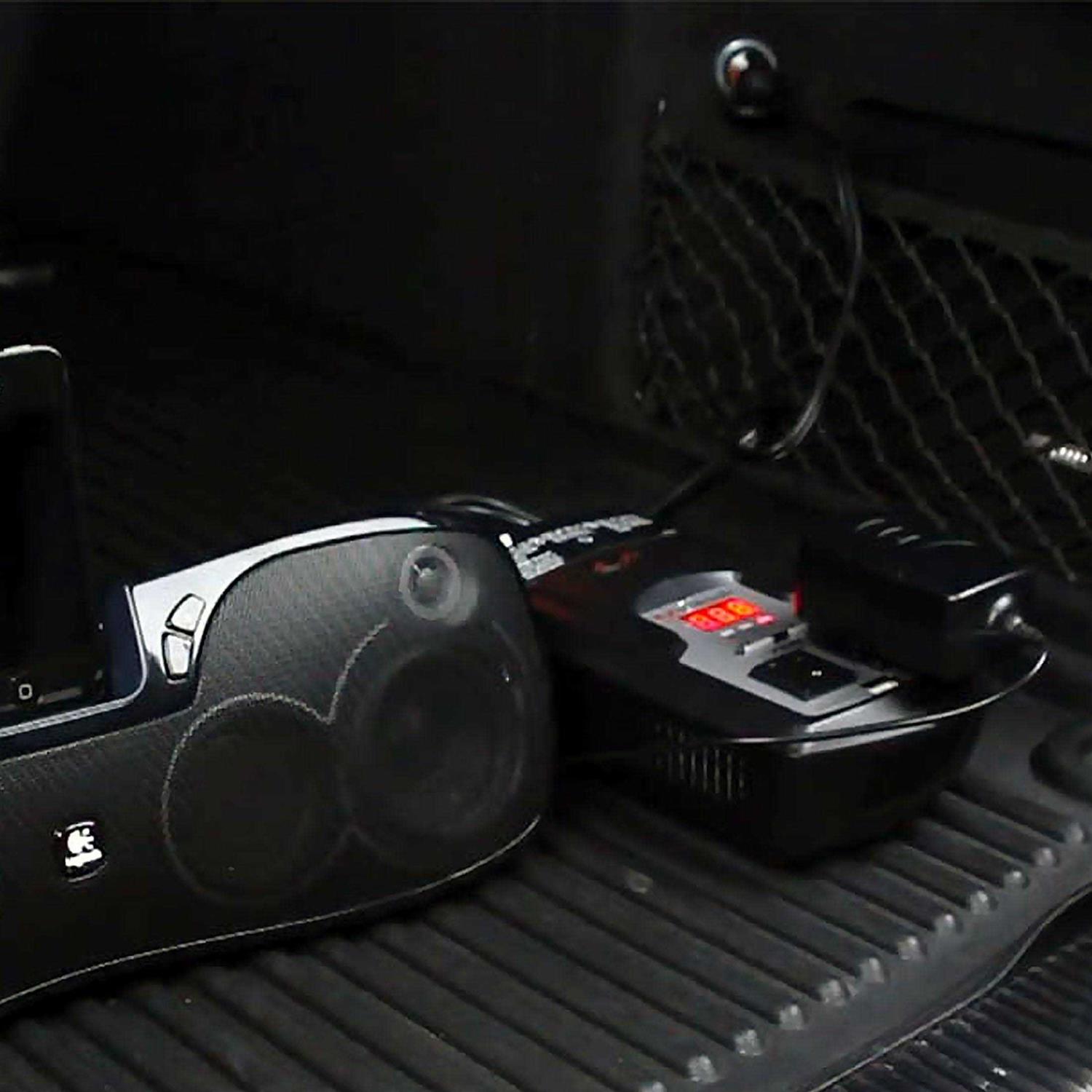- Easily plugs into vehicle’s accessory outlet or connects directly to battery with clamps