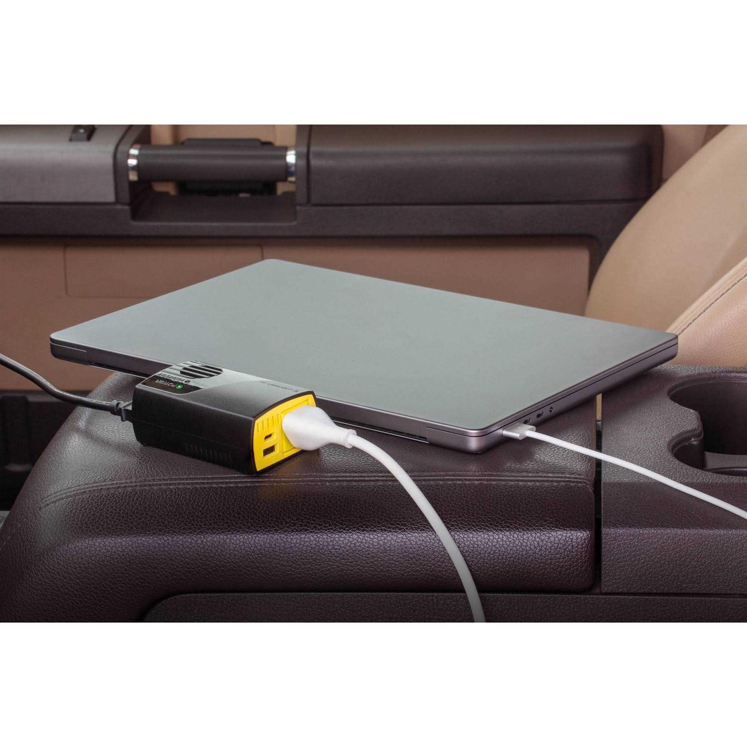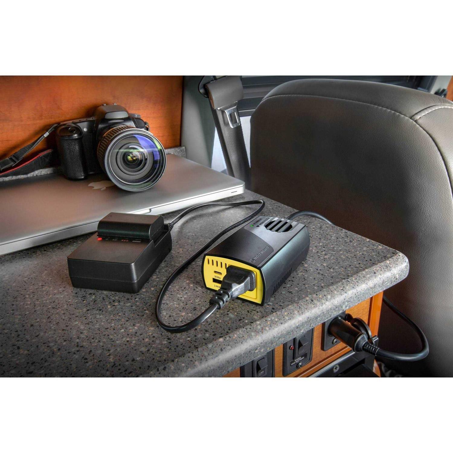 The Scosche Pi150m Invert150 car power inverter with 150-watts of power lets you power & charge up to 3 devices at once. Plug the 12V adapter into your vehicles 12VDC outlet or any other 12V powered outlet in order to power the inverter. Do not use in a cigarette lighter socket. Once plugged into a 12V outlet, use the AC wall outlet to charge your small Electronics or other devices which receive power from an AC plug. Get power output levels at 150W constant or 300W peak. The LED indicator turns green to let you know that the inverter is powered on or red during standby with the power protection mode. Featuring multiple layers of safety for a safe charging experience against overheating from the built-in cooling fan. Additional features include short circuit, overload, and temperature control protection. The dual USB ports let you fast charge most standard USB devices with up to 1 or 2.1 AMP’s of power. It’s perfect for charging during driving or while stopped on the road. The Scosche Invert150 brings the power to you while on the go, on long road trips or vacations, so you’ll never be without power when you need it. This durable inverter is backed by Scosche’s Lifetime Tech Support and 1 year .