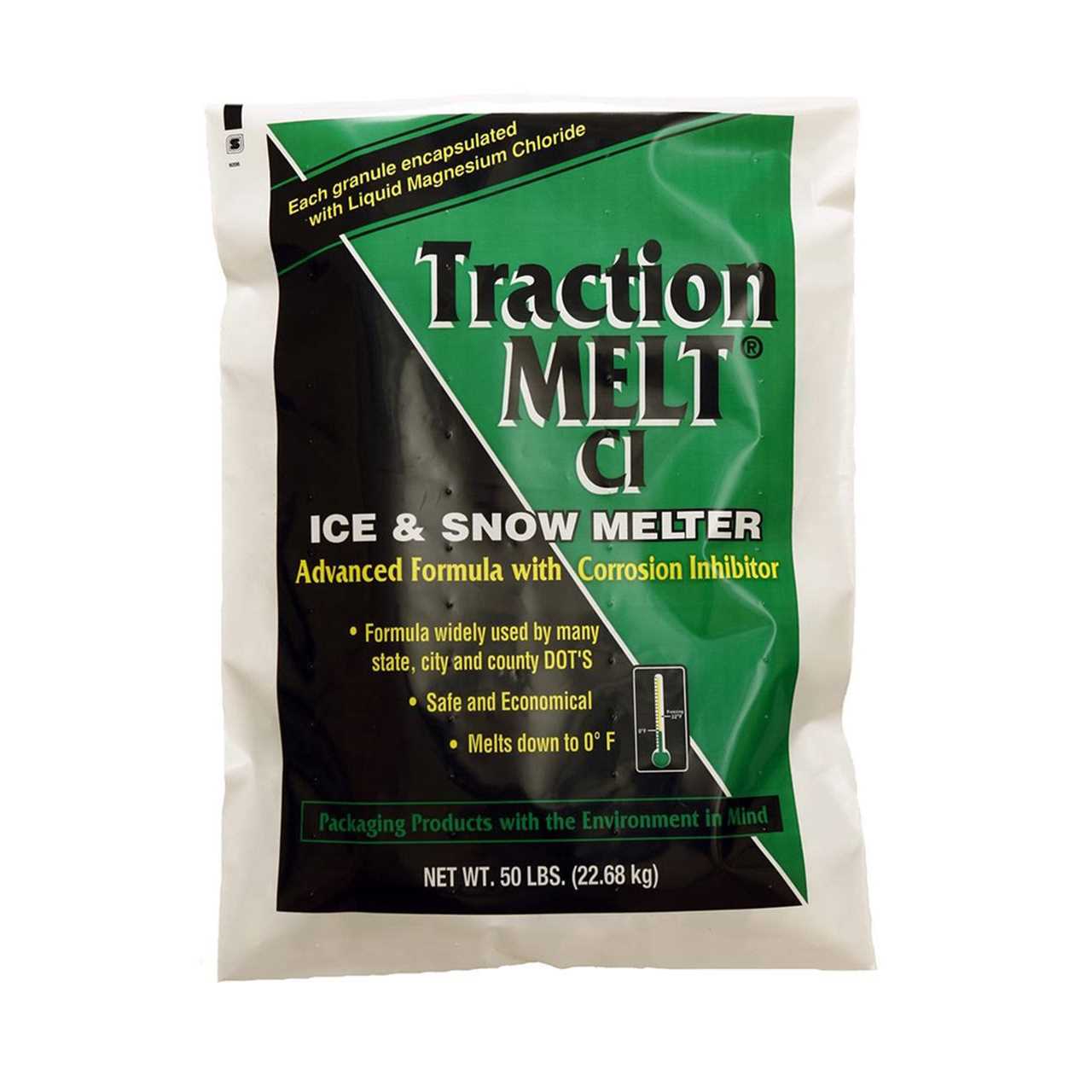 Icy roadways, sidewalks, driveways, and steps are safer thanks to Traction Melt ice melter. Each granule of this product is encapsulated by liquid magnesium chloride for instant traction in cold temperatures down to 0 degrees F. If used correctly, its safe for concrete and vegetation.OrderingThere is a minimum order of one bag of this ice melter. Each bag contains 50lbs. of granules for plenty of coverage during the wintertime! 50 bags/pallet.
