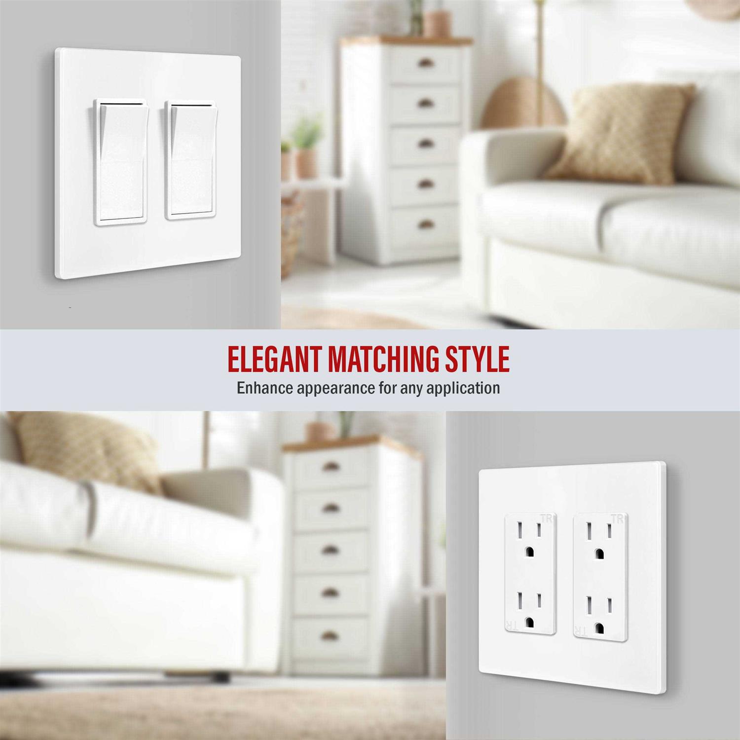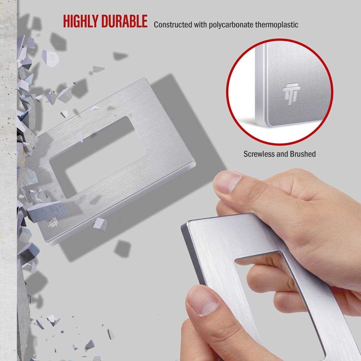 ENERLITES screwless wall plates are made from Polycarbonate Thermoplastic material to provide the durability and resilience needed to resist heavy impacts. ENERLITES screwless wall plates use snap-on covers to conceal screws from young children. The child-safe design features a hidden lock that can only be opened with a screwdriver.