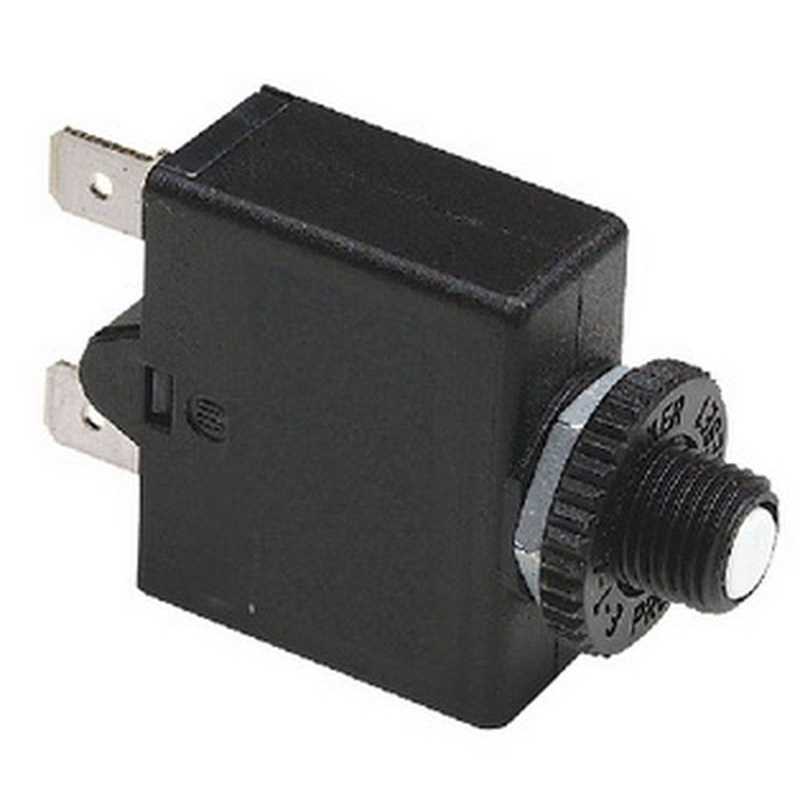 Push to reset, single pole circuit breakers are calibrated and tested. A proven “Snap-Acting” bi-metallic thermal sensing mechanism is used to interrupt current flow. Manual push to reset reinstates current flow. Max panel thickness 1/4″ w/ 3/8″ hole. 1/2″ W x 1-5/32″ H x 7/8″ D.