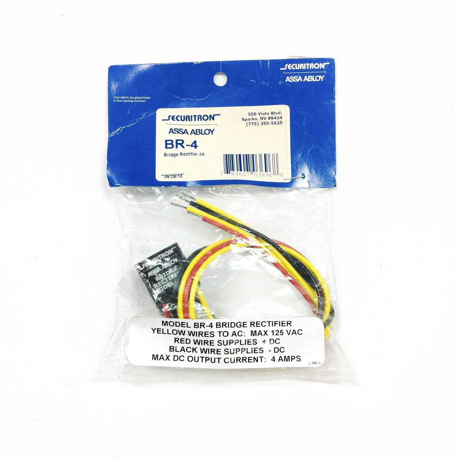 The Securitron BR-4 Bridge Rectifier, 4 Amp is a 4 Amp Bridge Rectifier that converts AC input to full wave rectified DC output with a maximum 4A output capacity.