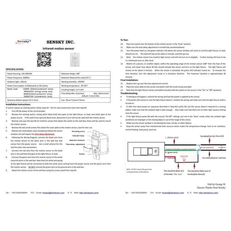 Voltage:110 -240v/acdetection Distance:9m Max( 5-10lux) , It’s Won’t Work, Even If There Is A Moving Man. At This Condition, Please Do Cover The Detection Area With Your Hand About 30 Seconds. Sensky Bs033c Motion Sensor Switch Instruction The Product Adopts Good Sensitivity Detector, Integrated Circuit. It Gathers Automatism, Convenient Safe, Saving-energy And Practical Functions. It Utilizes The Infrared Energy From Human As Control-signal Source, It Can Start The Load At Once When One Enters Detection Field. It Can Identify Day And Night Automatically. It Is Easy To Install. Noted: This Product Only Works In The Dusk Or Evening When The Ambient Light Is Less Than 20 Lux Or No Any Light In The Surrounding Environment. Specification Input Voltage 110v/ac-240v/ac Detection Range 180 Degree Power Frequency 50/60hz Detection Distance 9m Max(less Than 24°c); Ambient Light: The Switch Will Work When It Less Than 20lux(switch On The ‘auto’ Position) ; Working Humidity : Higher Than 93%rh ; Time-delay Min.:10sec( More Or Less) Max.:7min Working Temperature 20~40°c Rated Load 1200w /220v(incandescent Lamp) 300w/220v (energy-saving Lamp) 800w/110v (incandescent Lamp) 800w/110v (incandescent Lamp) Power Consumption 0.45w(work); 0.1w (static) Detection Motion Speed 0.6~1.5m/s Size 70mm*115mm*35mm Function: 1.it Can Only Work In The Ambient Light Less Than 20lux (dark). 2.time-delay Is Added Continually: When It Receives The Second Induction Signals After The First Induction, It Will Compute Time Once More On The Rest Of The First Time-delay Basic (set Time). 3.time-delay Adjustment: It Can Be Set According To The Consumer’s Desire. The Minimum Time Is 10secsec. The Maximum Is 7minmin. 4. Switch: ‘on?’ off?’ auto’