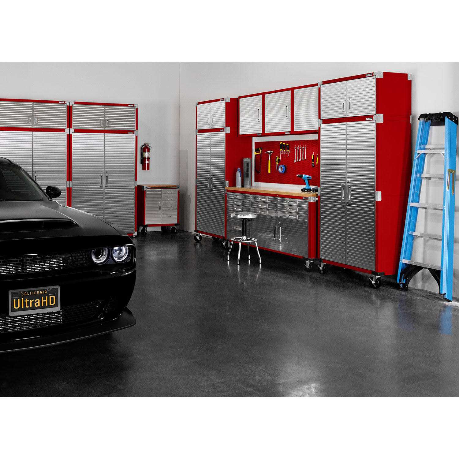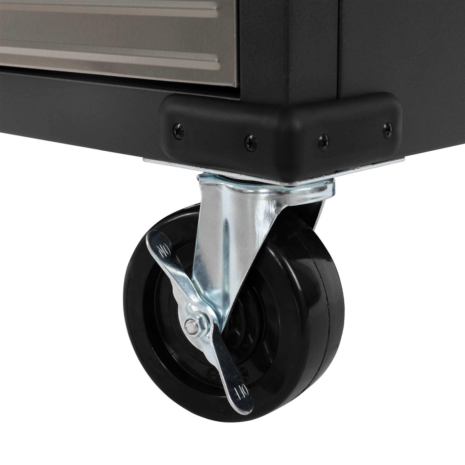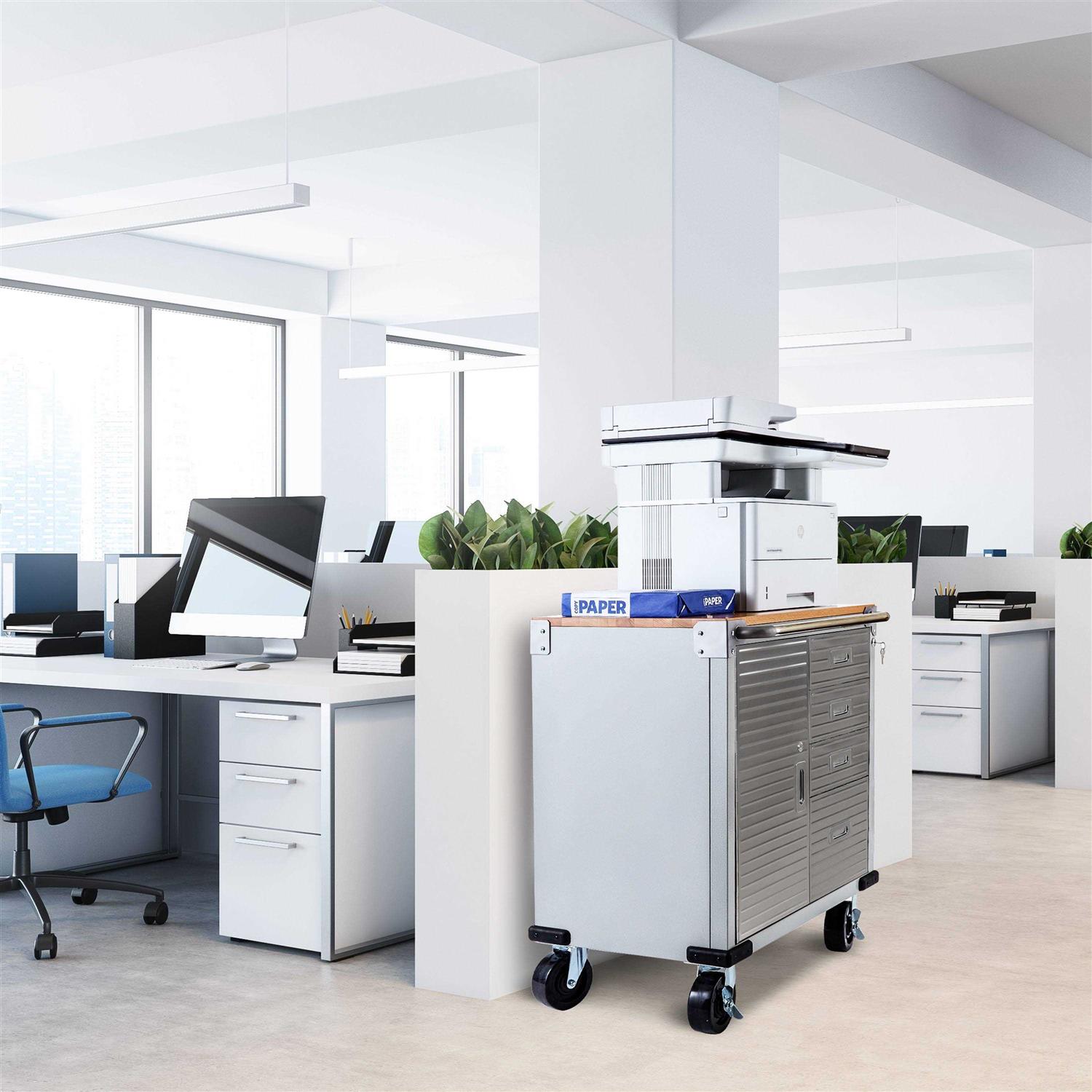 Utility and mobility come together in Seville Classics UltraHD 4-Drawer Rolling Cabinet. Our cabinet is engineered for heavy-duty use with a body constructed of ribbed, commercial-grade steel. The 3/4” solid hardwood top is intended for use as a work surface for everyone from home mechanics to professional tradesmen. Cabinet includes a cabinet (13.25′ W x 21′ D x 26′ H) with an adjustable height shelf, three small drawers (4′ H) and one large drawer (9” H) with cushioned liners and a locking system (with key) to keep your tools and supplies safe. Drawers feature ribbed stainless-steel fronts to protect against dents and divots. The drawers are finished in UltraGuard fingerprint-resistant coating to protect against grease and oils. Simply wipe down with soap and warm water to clean. Body is finished in a durable epoxy powder-coat finish for long lasting protection. The included four 2′ Wide x 5′ High rolling casters allow your equipment to go where you do. Two casters feature brakes for stability when you need it. Control the cabinet while it’s on the move with the thick tubular handle finished in chrome. Black polycarbonate bumpers protect the corners while the cart is in motion, and helps keep your workshop safe while is stopped. It’s the perfect multipurpose cabinet for businesses and homes alike. Can I Lock the Drawers & Door? Yes! Cabinet includes keys and a single lock to secure the drawers and cabinet while you’re away. Keep your equipment safe. Non-slip liners keep your things from moving when accessing drawers and rolling the cabinet. How Tall and Deep Are the Drawers? The small drawers are 4′ high and the large drawer is 9′ high. Each drawer measures 21′ deep and 11.75′ wide. It’s perfect for multipurpose use in around the home, in the garage, or for storage organization at your business.Can I Assemble Alone? Yes! Assembly can be completed by one person with no extra tools needed. Cabinet includes a magnetic screwdriver for you convenience, and detailed assembly and care instructions. Putting the unit together takes minutes.