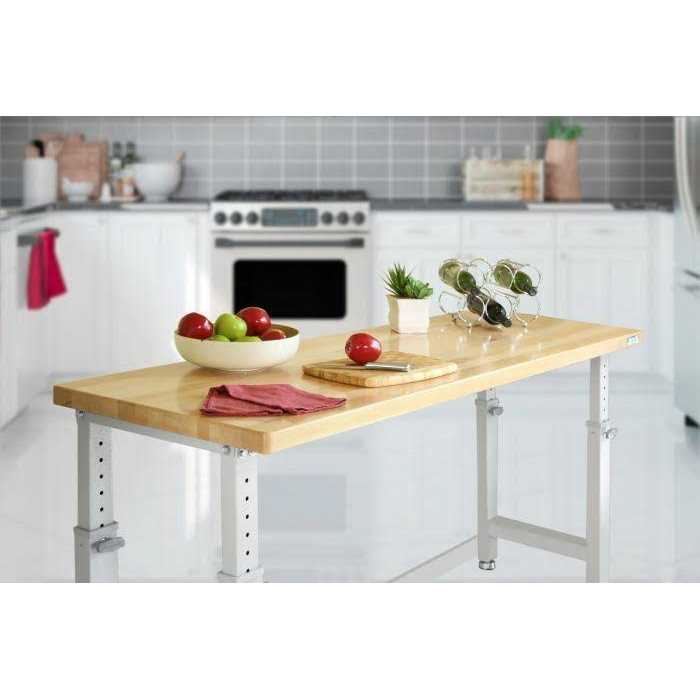Assembled Dimensions: 72″ W x 25″ D x 28.5″ H Inner Dimensions: 61.5″ W x 23.125″ D Height adjustable at 1″ increments ranges from 28.5″ to 42″ H (four locking knobs) Solid polyurethane-coated wood top measures 1.75″ thick Available finishes: Granite, model no. UHD20292B Graphite, model no. UHD20293B Commercial-grade steel frame Four padded leveling feet 3″ casters can be purchased separately here Total weight capacity: 1000 lb. Net Weight: 129.8 lb. This product requires assembly (all tools required are included) and is intended for indoor use only. View assembly instructions here