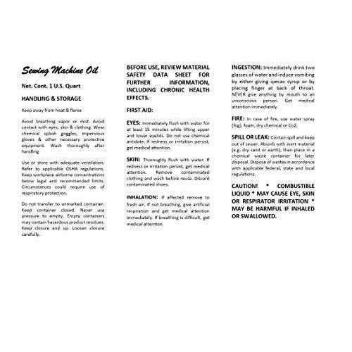 Lily White is a highly refined sewing machine oil,for high speed industrial sewing machines, and also good for the home sewing machine use. Made in USA – low viscosity, water white lubricating oil for wewing machines, textile machinery and parts Excellent for use in application where oil may come into contact with fabrics. Contains: formulated mineral oil Age Group: adult.