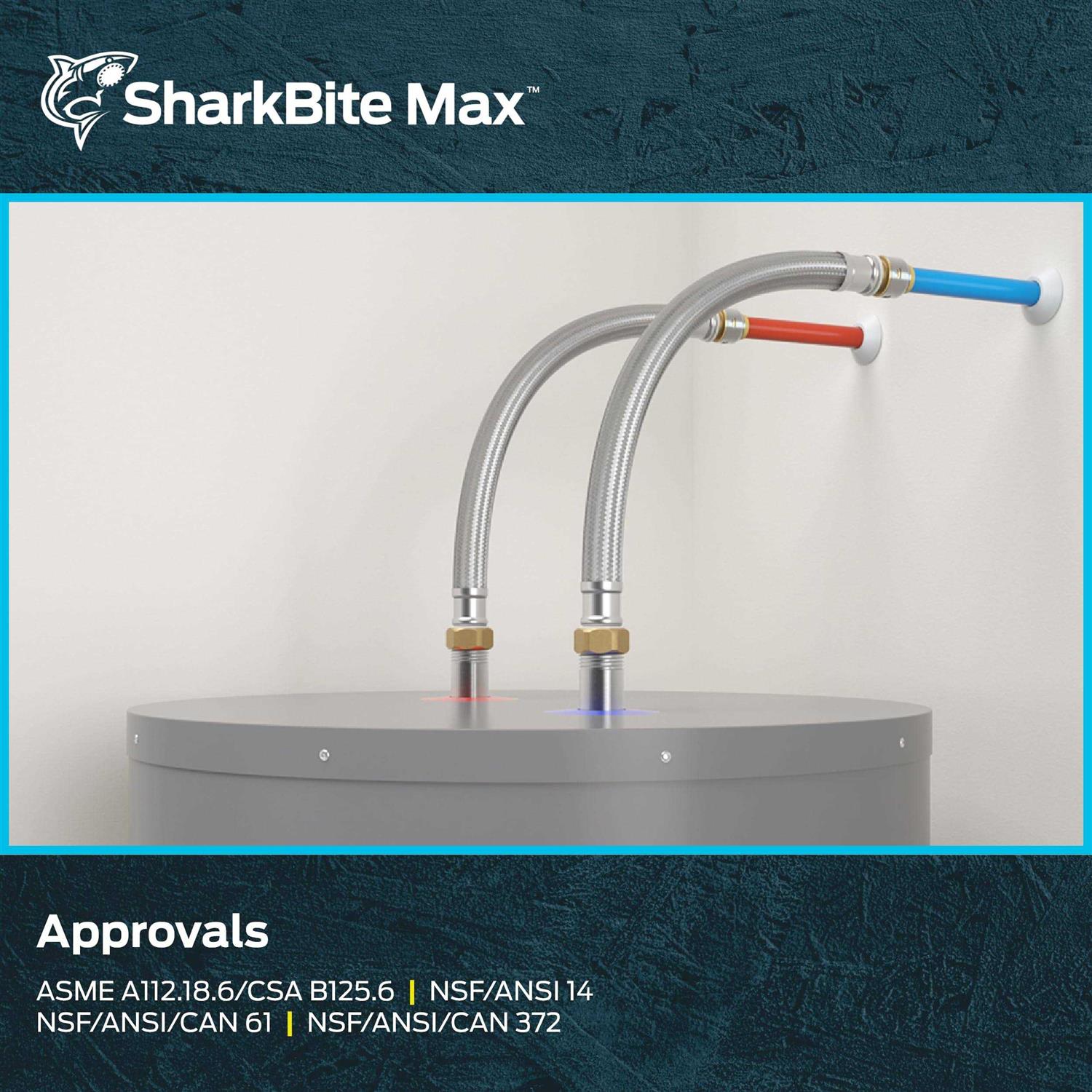 SharkBite Max flexible water heater connectors are the fastest and easiest way to connect your water heater to existing pipes in your home. A newly designed stainless steel collet retainer delivers additional strength and durability and provides a 200 psi pressure rating. SharkBite Max connectors do not require a PEX tube liner, and a re-engineered body allows you to insert the pipe using less force and greater ease. No soldering, clamps, unions, glue, or special tools required. After inserting to pipe, stainless steel teeth bite down and grip the pipe tightly while a specially formulated O-ring compresses around the pipe to create a watertight seal. The flexible stainless steel braided hose reduces the need for extra joints or fittings, allowing for faster installs. Available in additional lengths (12 in. to 24 in.) and with integrated ball valve shut off.