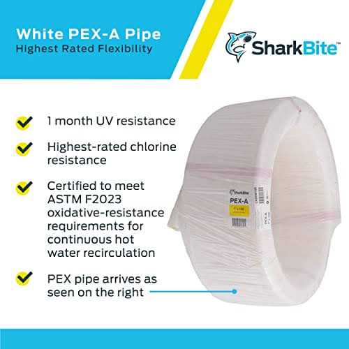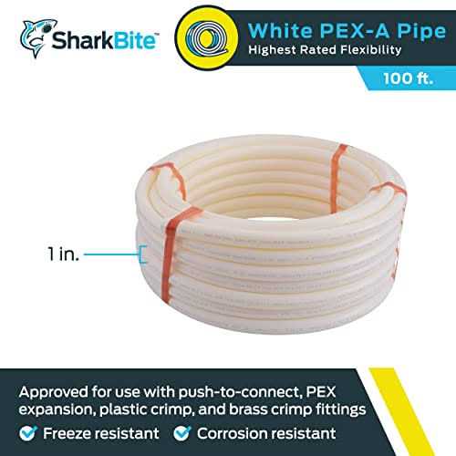 SharkBite PEX-A is a cross-linked polyethylene tubing designed for use in residential and commercial plumbing applications. PEX pipe is flexible and easy to work with, which reduces the number of fittings needed to complete a job; reducing cost and leak points. PEX is also extremely durable and corrosion or freeze resistant. SharkBite PEX-A is compatible PEX F-1960 expansion fittings, EvoPEX fittings, PEX F-1807/2159 crimp fittings or push-to-connect fittings. Color: White.