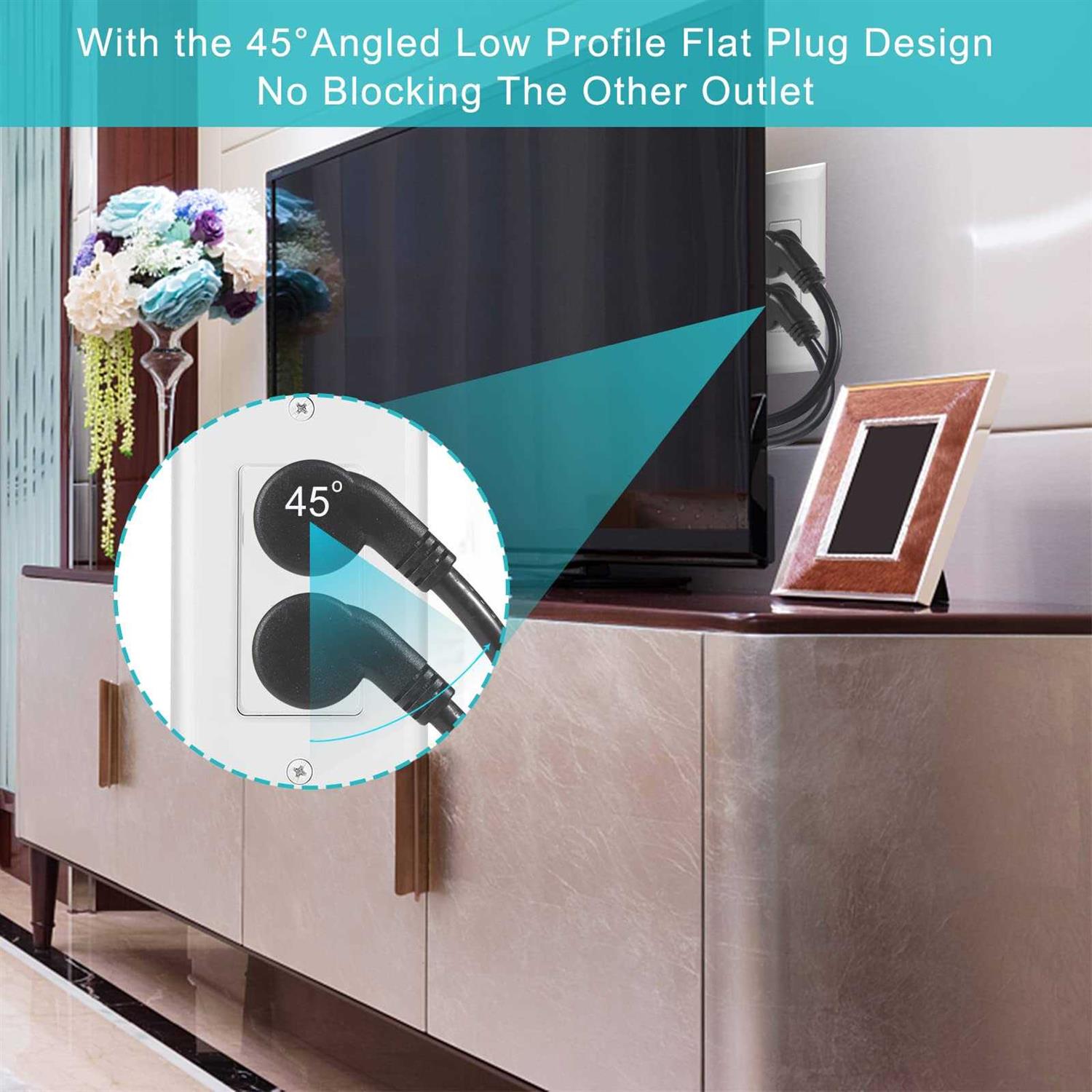 【1 FT Flat Plug Extension Cord】Specifications: Connectors: NEMA 5-15P – NEMA 5-15R. Wire Gauge: 16AWG/3C. Rated to carry: 125V at 13A,1625W, Design for adding the exist length to your household appliance by the low profile angle flat plug, which allow appliances and furniture to get closer to the wall without damage to the plug. 【No Blocking The Other Outlet】With the 45°Angled Low Profile Flat Plug Design can provides access to the plug receptacle that is blocked by another device,which allows you to use two power sockets at the same time. 【Handy for Outlets Behind Furniture】The flat plug solved a tight situation involving limited space. the flush design was perfect for your project & your hutch unit was able to back up flat to the wall. Ideal for tight spaces or behind furniture such as sofas, TVs, bookshelves, cabinets and bedside nightstands to keep the furniture closer to the wall. Good at low profile outlet connection for space. 【More Secure Than Normal Standard Plug】This flat plug allows you to drop down the standard plug and with a flat wall plug you can plug something in behind furniture that’s up against a wall without bending cord , which gives a more secure connection to the wall. 【Wide Compatibility】Those short AC power cord compatible both with 3 Prong extension cord and 2 prong power cord , which are reliable for most of household appliances extend uses, such as toaster ,espresso machine 1600w , freezer , wall mounted TV,microwave, and other appliances that uses the 3-pin male-to-female shroud power connector: NEMA 5-15P to NEMA 5-15R.