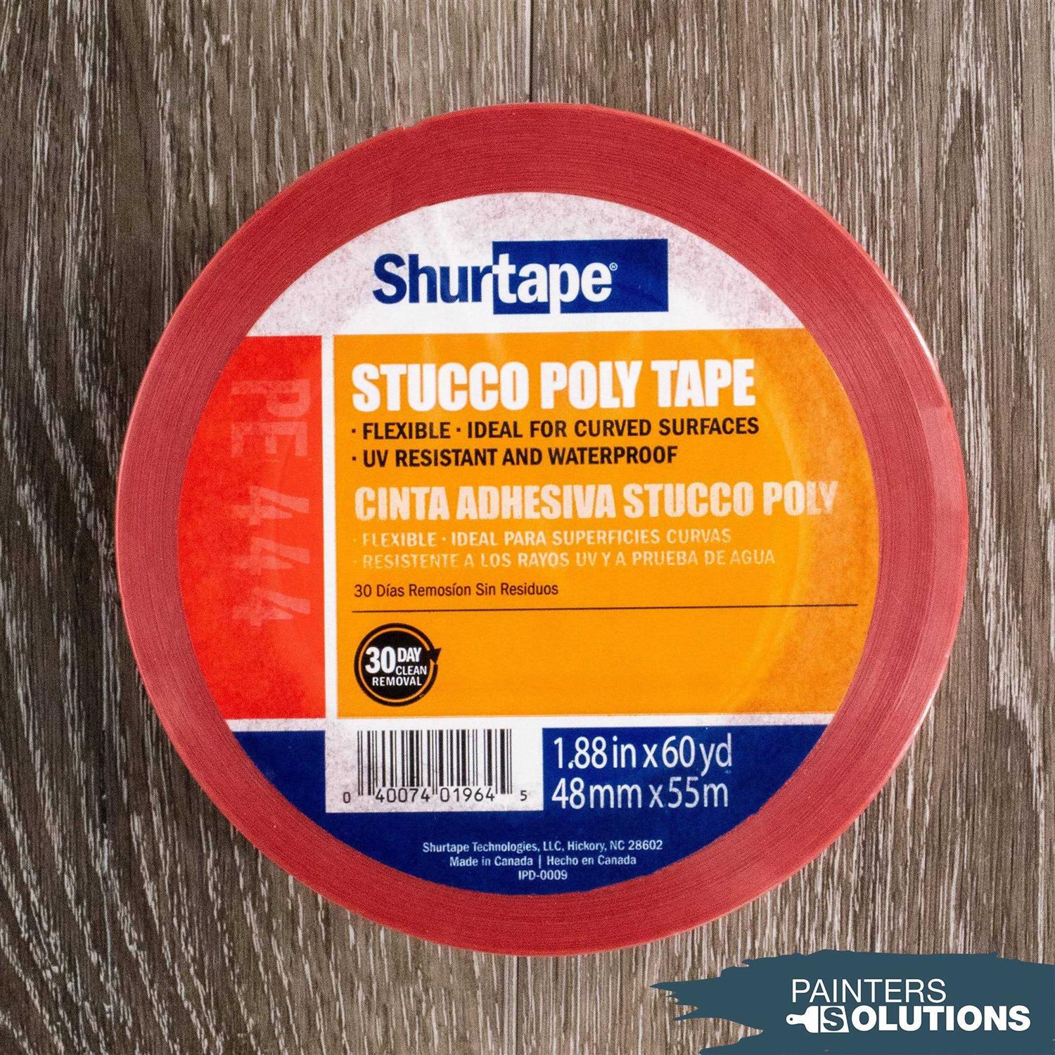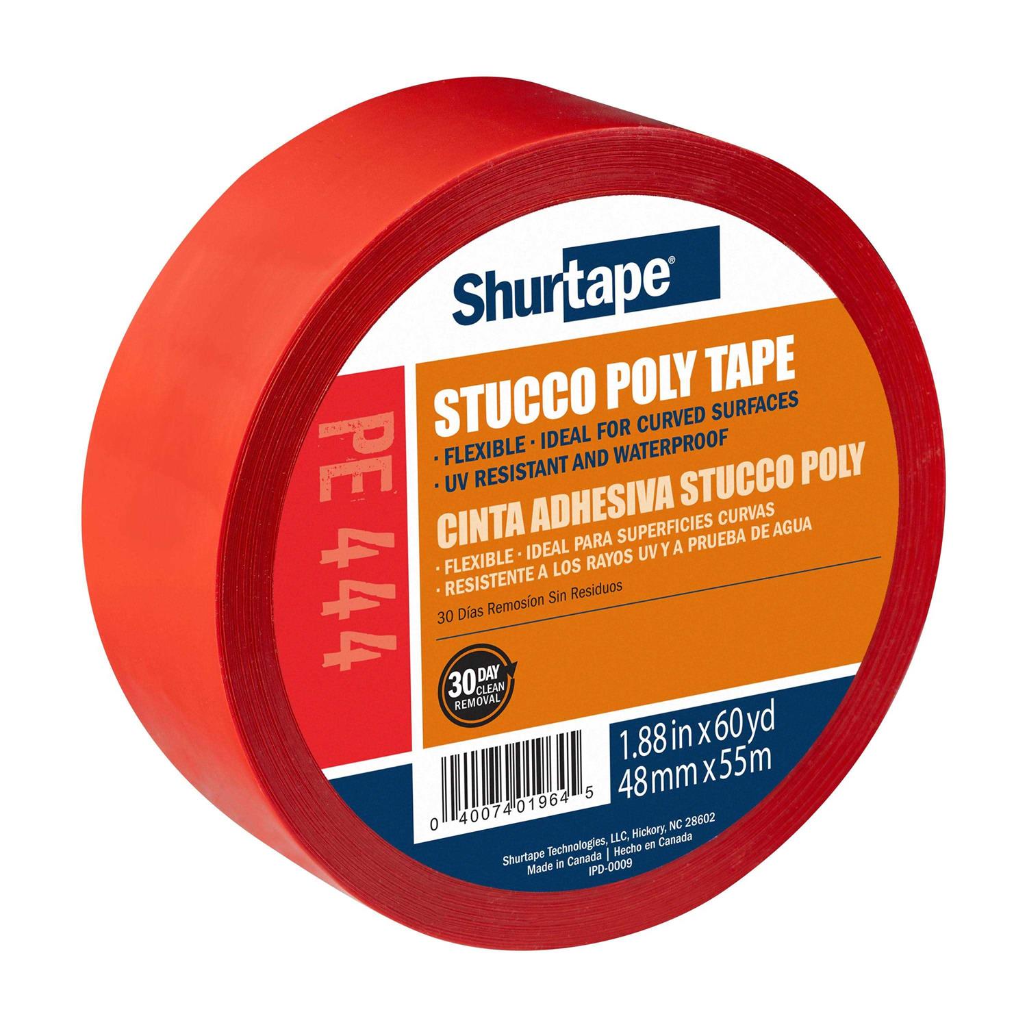Shurtape 444 UV-Resistant Stucco Red Masking Tape – 48 mm x 55 m is a UV-resistant polyethylene film tape used to mask surfaces, such as windows and doors, during stucco application and painting. PE 444 is a stucco masking tape engineered for outdoor use.
