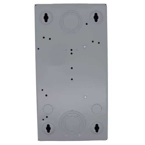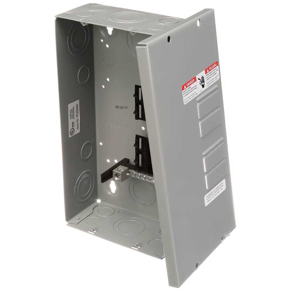 Code-gauge steel enclosure. 10,000 AIR. One piece plated aluminum bus bar. 100 percent circuit breaker twistouts. Positive load side circuit breaker hook rail. Suitable for use as service equipment when a main breaker (100 amp maximum) is back-fed in a branch position and used with main breaker retainer clip No.MBR1. When used as service equipment, any unused neutral position may be used for equipment grounding. Rotate entire device 180 degrees for bottom feed. Gray enamel finish. 6-5/8″ x 12-5/8″ x 3-1/2″. UL Listed, complies fully with NEC and UL requirements for Class CTL.