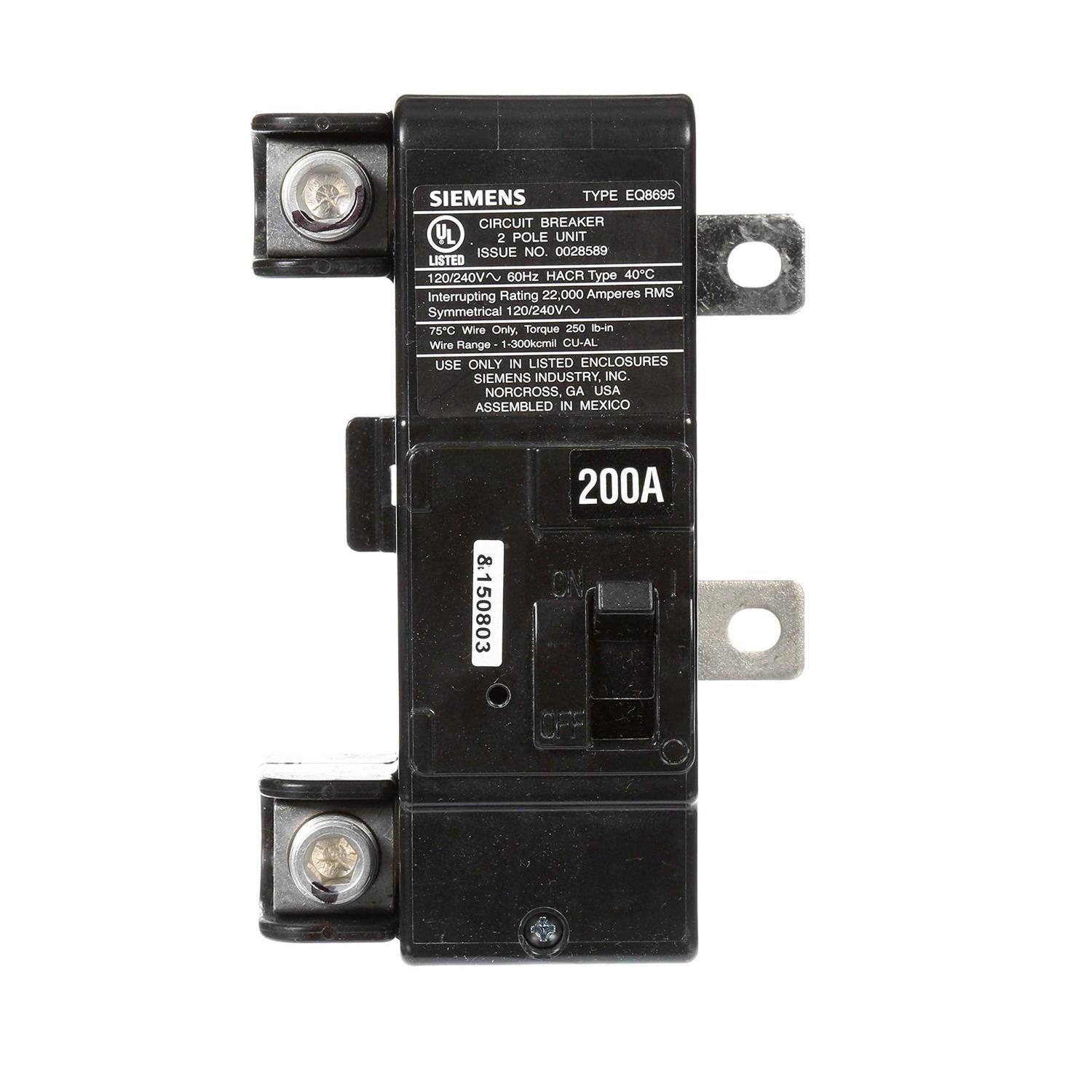 Siemens Main breaker kit measuring 6 .300 Inch x 4.700 Inch x 4.100 Inch operates at a current rating of 200 Amps and has an interrupt current rating of 22 kilo – Amps. It finds use on 200 Amps load center. It operates at a voltage rating of 120/240 Volts. It is used for converting a lug load center into main breaker load center. Kit is UL listed.