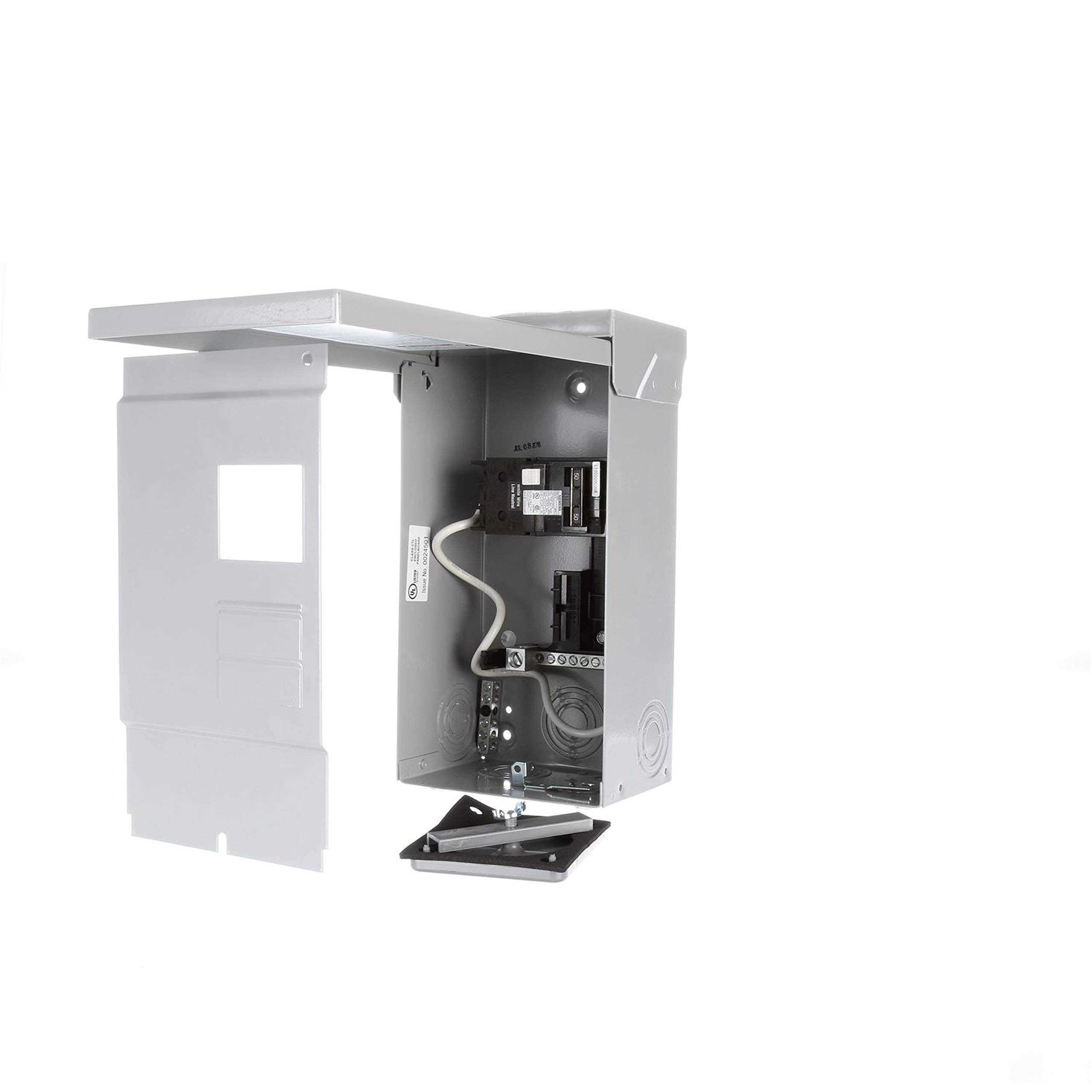 Open-Box — Siemens 50 Amp spa panel comes in an outdoor rated enclosure, includes a 50 Amp two-pole GFCI breaker, and also has 2 additional spaces for extra branch circuits. A cover plate and ground bar are included. The total panel rating is 125 Amps.