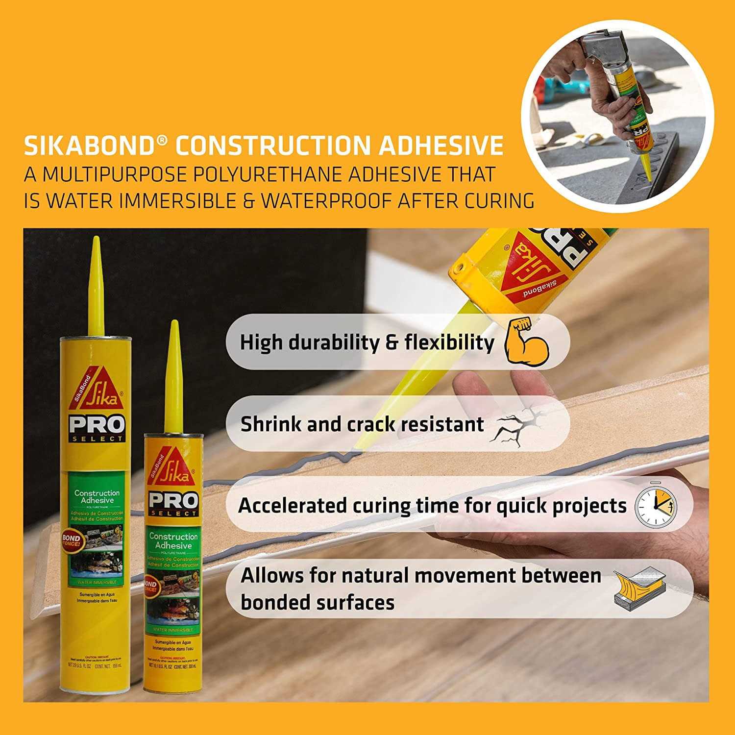 Our aim is continuous improvement and user satisfaction through effective implementation and quality of our products. Features. Sikabond Construction AdhesiveSpecifications. Capacity: 10.1 oz.
