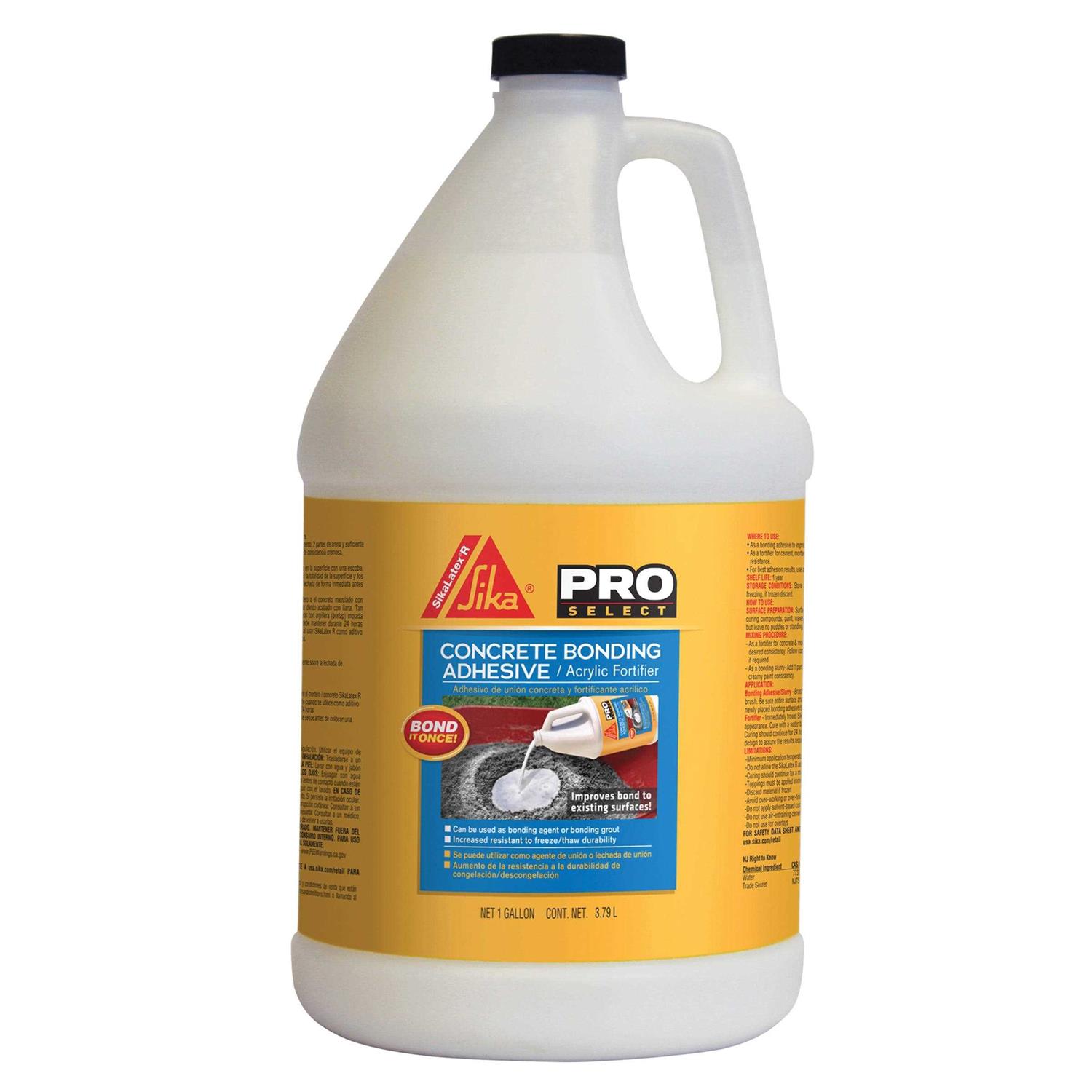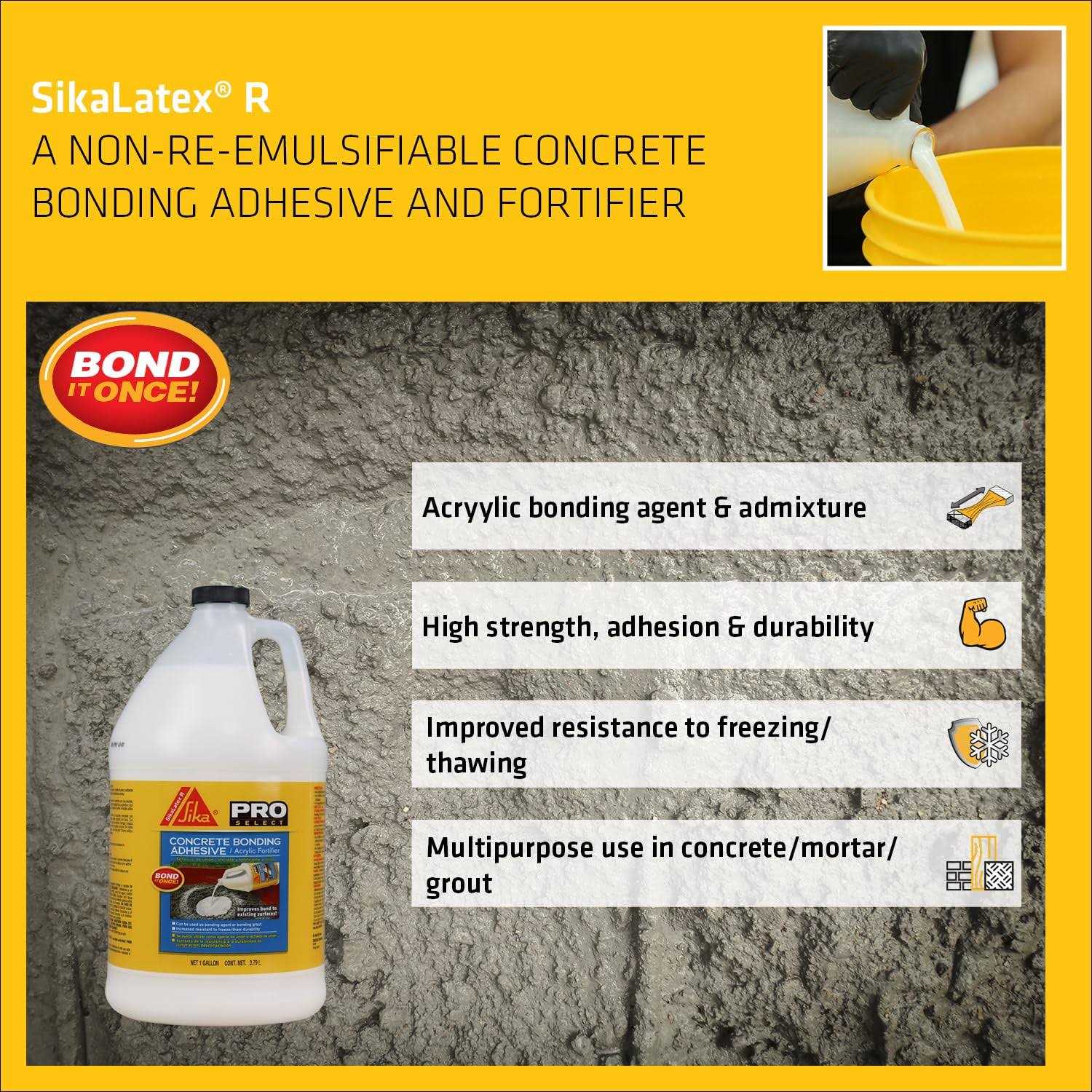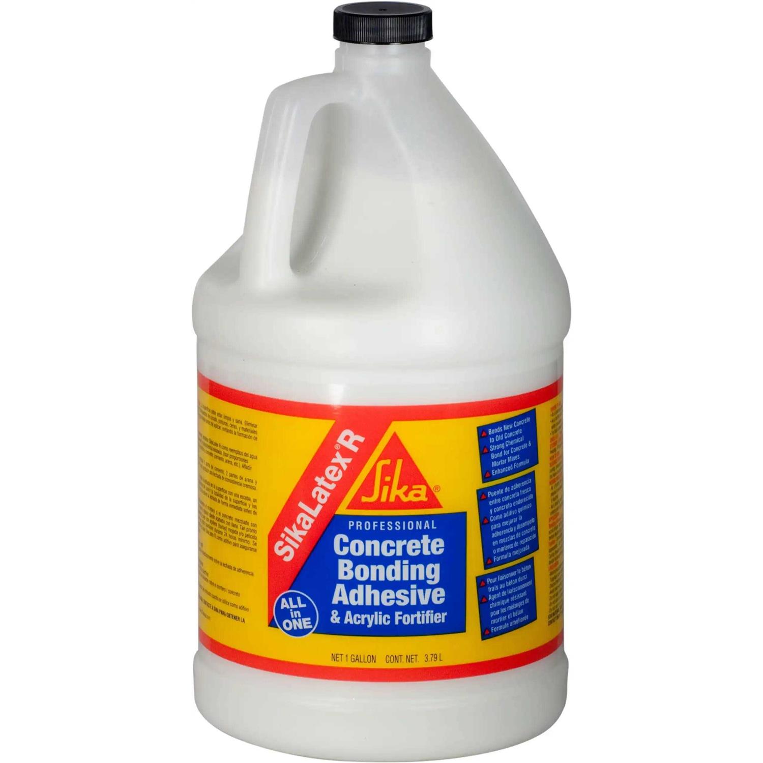 SikaLatex R concrete bonding adhesive and acrylic fortifier is designed as an all-in-one formula. This low VOC formula is ideal for bonding new concrete to existing concrete. It also improves adhesion characteristics and requires no wait time before applying a top coat.