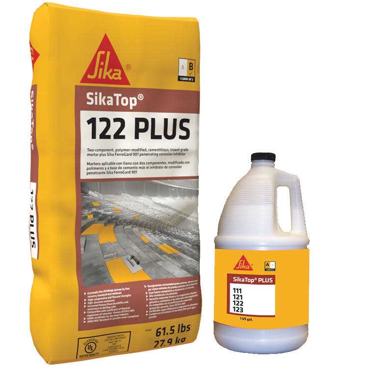 SikaTop 122 PLUS is a two-component polymer-modified, portland cement based, fast-setting, trowel-grade mortar. It is a high performance repair mortar for horizontal and vertical surfaces and offers the additional benefit of Sika FerroGard 901, a penetrating corrosion inhibitor.