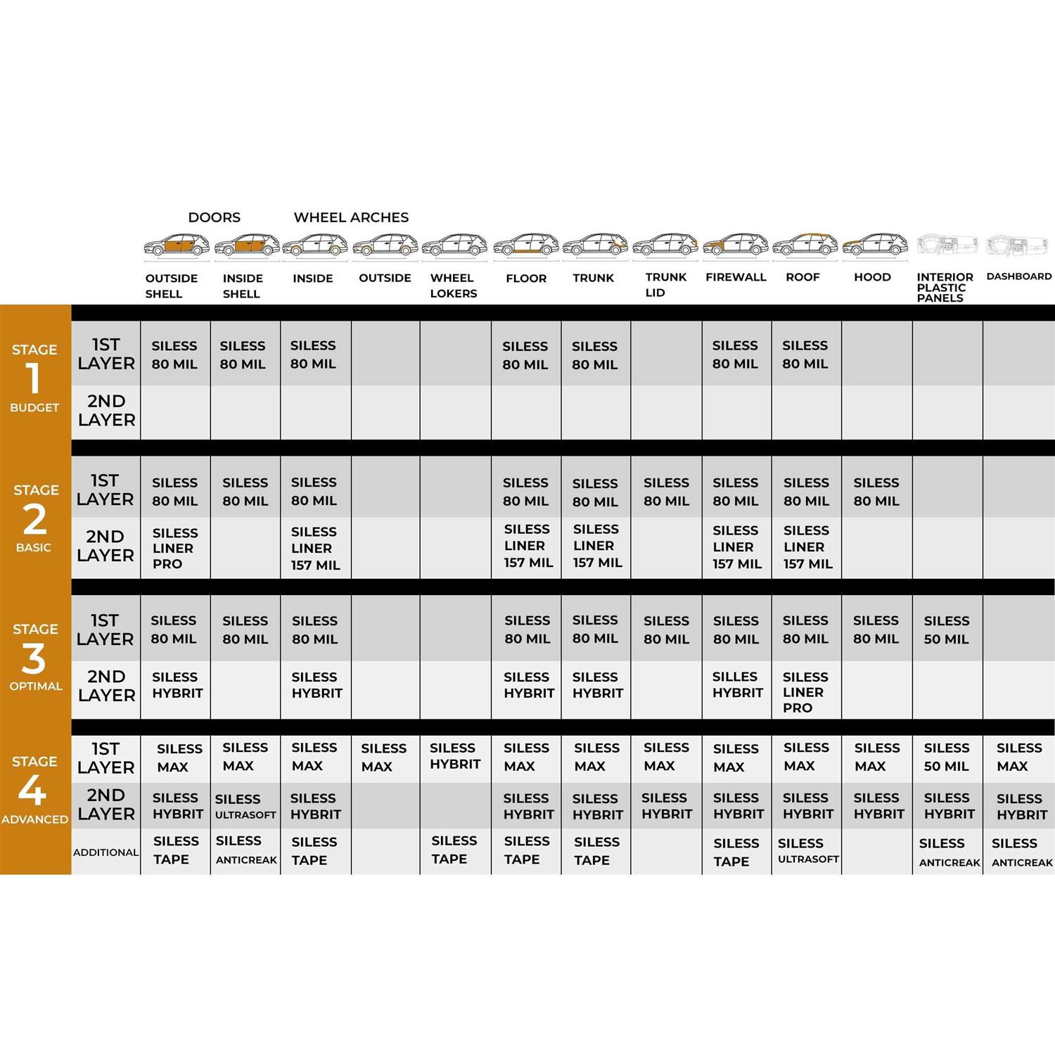 Siless VIBRO 80 mil is ultimate quality sound deadening insulation. Designed for the automotive industry as an industrial sound damping material for applications that need extreme performance, it is well suited to the demanding car enthusiast as well. Advanced Formulation – SILESS VIBRO Damping Material consists of newly invented Bmastic, technologically most advanced and efficient sound deadening composition on the market today. Value – SILESS VIBRO Damping Material is just priced to be cost effective, when compared to similar products on the market. Car soundproofing does not have to be expensive to work!! Ease of Installation — SILESS VIBRO Damping Material is easy to install with a “peel and place” application. Simply trim the pieces to fit, peel and place and hand roll to ensure good adhesion. No messy spray-on paints or adhesives are needed to install this product. SILESS VIBRO specs — Thickness 80 mil/ 0.08 inches/ 2mm, Coverage area – 18 ft², Number of Boxes – 1, Number of sheets in each box – 7, Each sheet size – 23.6 x 15.94 inches. The installation instructions are included in the package, but a roller isn’t. Sound Deadening is one of the most effective things you can do to your car to improve sound quality and eliminate road noise. br br SILESS was originally designed for the automotive industry and engineered for car soundproofing and sound dampening. br br By reducing or dampening sound vibration in the metal panels of your car, you can eliminate road noise. br br Whether you are trying to improve the quality of your car stereo or give your vehicle that “luxury car” feel, SILESS is the ideal material. br br Unlike some other companies, who use repurposed asphalt roofing materials, SILESS created industry approved Bmastic technologically br advanced formulation that is lightweight, easy to cut, super sticky, and 20-30% more effective than any competitors on the market. br br Some companies use technology and processes created over 10 years ago, and selling their products at a price 3 times higher than Siless. br br SILESS will install easily and stick to all and any interior surfaces, such as; floors, doors, roof, hood, trunk lid, br quarter panels and will easily stick to a any other surface and will stay in place without any special preparation, br and without any messy drippings and odor. br br Installing together SILESS VIBRO and SILESS LINER – such as SILESS 157 mil and you’ve got a ride with even more noise-blocking outcome. br br First layer of SILESS VIBRO provides 65% off road noise and vibrations and then second layer of SILESS LINER provides 35% coverage from excessive heat. br br Together, it is ULTIMATE SOLUTION for your sound dampening needs. br br Finally, SILESS today – the most advanced, industry approved, ultimate sound dampening material on the market. br br