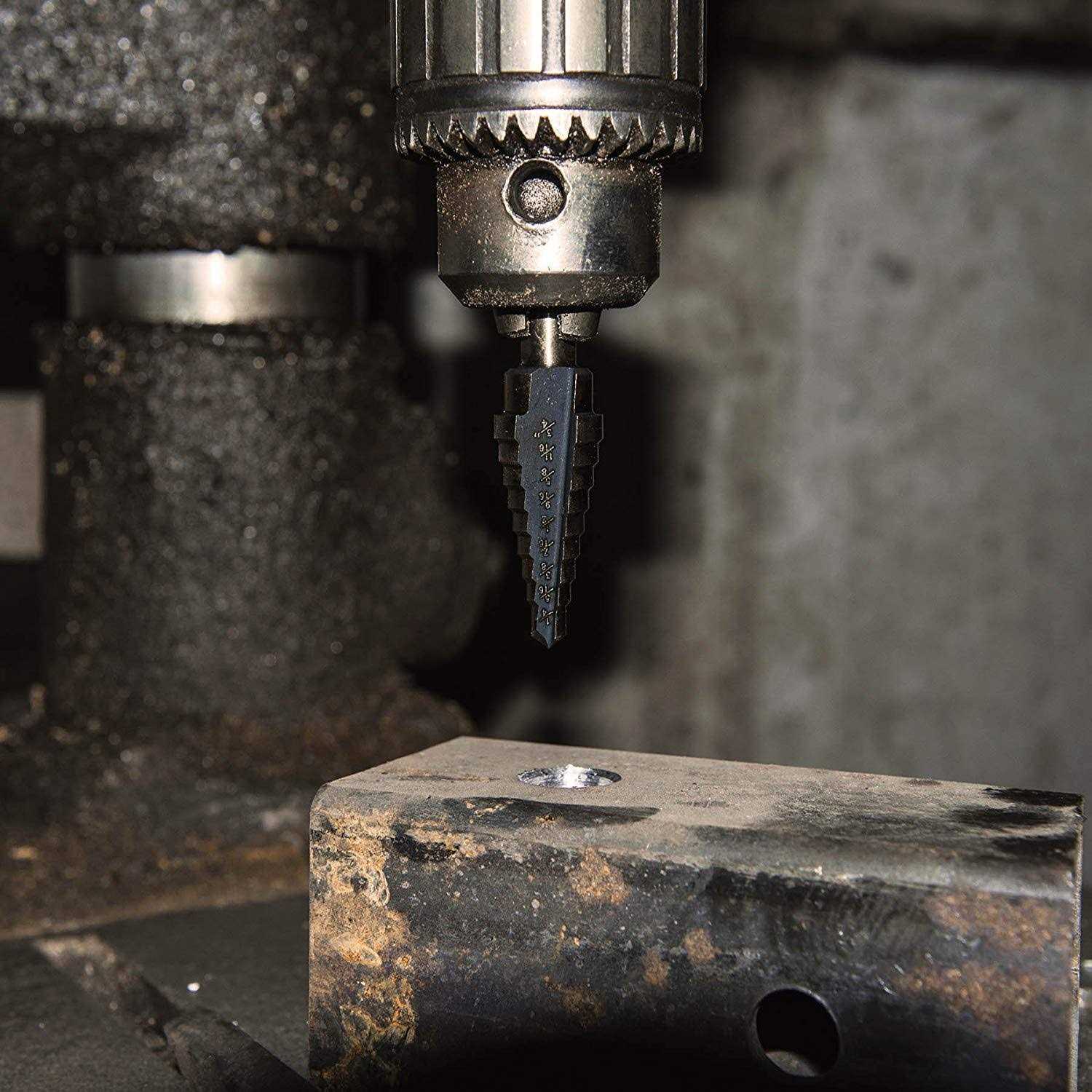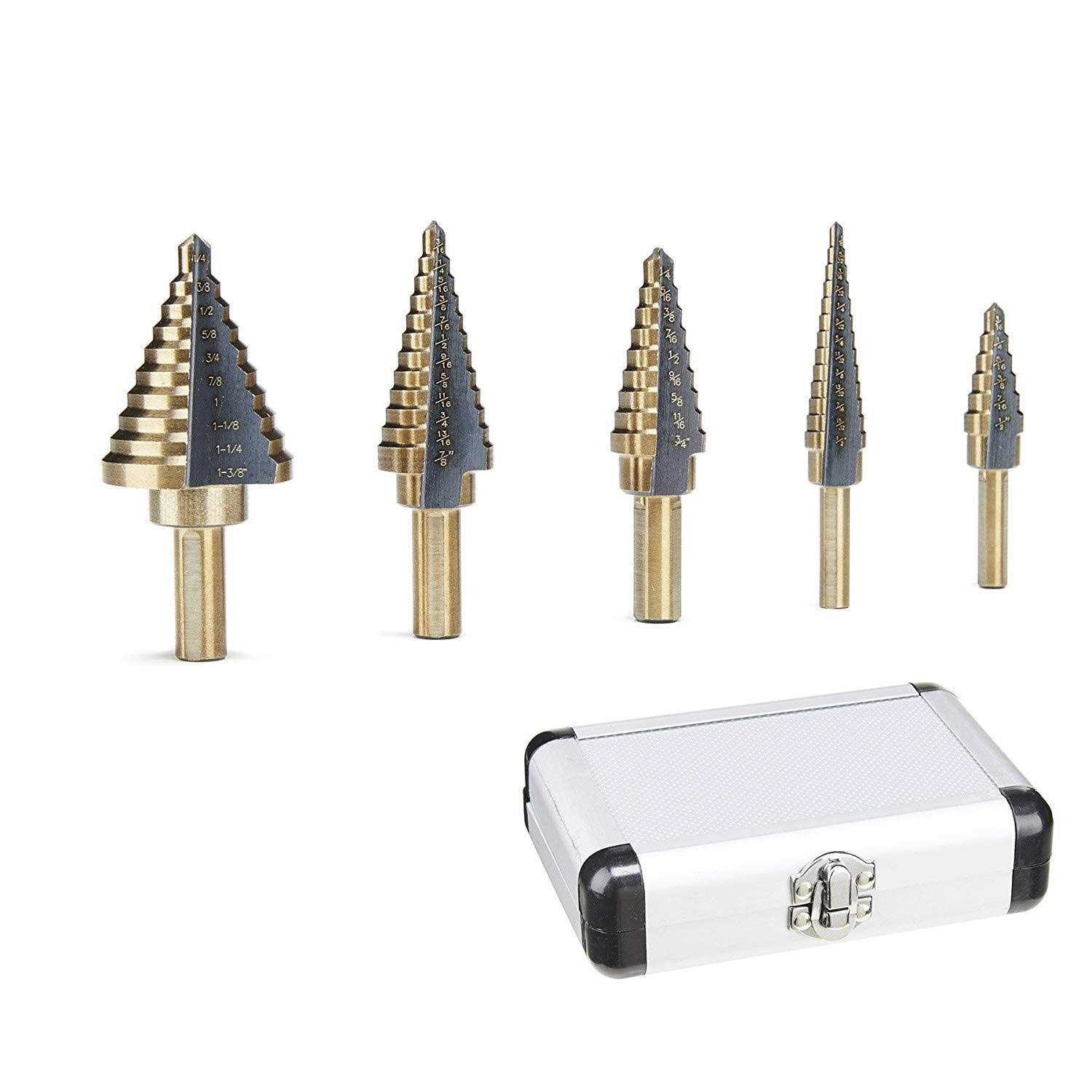 Cobalt high speed steel along with the titanium coating ensures extreme durability, will stay new and shiny for years to come. Different sized shanks ensure compatibility with 1/4, 3/8 and 1/2 in. chuck sizes. Non-walking drill tip provides fast and smooth drills on steel sheets, aluminum sheets, wood board, plastic board etc. (the board must be smaller in thickness than the height of step drill bits). Please mark the spot that you are to drill for easier drilling and improved drill bits life. All the bits come in a well-organized case for easy transport and storage. Product Size (Aluminum Box): 15x11x4cm br Product Configuration: Aluminum Box x1 br 1/4-1-3/8″x1 branch br 3/16-7/8″x1 branch br 1/4-3/4″x1 branch br 1/8-1/2″x1 branch br 3/16-1/2″x1 branch ol li 3/16″ to 1/2″ 6 Steps (3/16”, 1/4”, 5/16″, 3/8”, 7/16”, 1/2”) /li li 1/8″ to 1/2″ 13 Steps (1/8″, 5/32″, 3/16”, 7/32″, 1/4”, 9/32″, 5/16″, 11/32″, 3/8”, 13/32″, 7/16”, 15/32″ , 1/2”) /li li 1/4″ to 3/4” 9 Steps (1/4”, 5/16″, 3/8″, 7/16″, 1/2″, 9/16″, 5/8″, 11/16″, 3/4″) /li li 1/4″ to 1-3/8″‘ 10 Steps (1/4”, 3/8″, 1/2″, 5/8″, 3/4″, 7/8″, 1″, 1-1/8″, 1-1/4″, 1-3/8″) /li li 3/16″ to 7/8″ 12 Steps (1/4”, 5/16″, 3/8″, 7/16″, 1/2″, 9/16″, 5/8″, 11/16″, 3/4″, 13/16″, 7/8″) /li /ol ul li 1 x 1/4-1-3/8 Step Drill 1 x 3/16-7/8 Step Drill 1 x 1/4-3/4 Step Drill 1 x 1/8-1/2 Step Drill 1 x 3/16-1/2 Step Drill /li /ul strong strong Notice: /strong /strong br Please keep cool and gentle using, the working life of the step drill bits can be largely prolonged by proper usage.