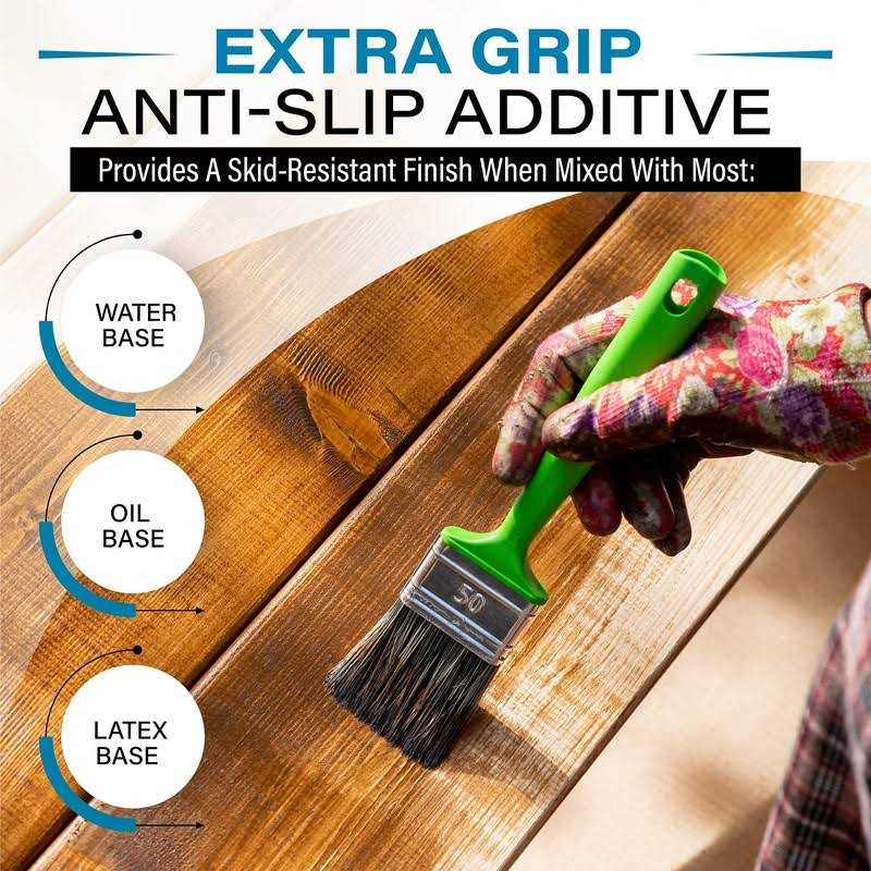 Creates a skid-resistant coating for wood, metal, fiberglass and concrete surfaces when mixed Easy to apply Long Lasting Industry Proven Formula No change in color or appearance Maintains proper coverage Extra Grip Anti-Slip Additive provides a skid-resistant finish when mixed with most water base, oil or latex-based paints. It is great for creating anti-slip, safe surfaces on indoor/outdoor floors, decks, stairs, ramps, ladders and more. For proper application, mix thoroughly into the paint until an even and consistent mixture is achieved. Stir often, do not shake, to avoid settling.