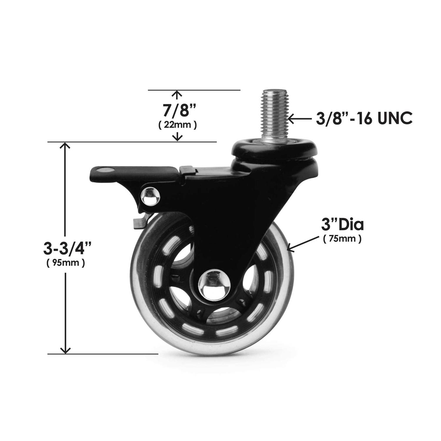 Stem Casters by Slipstick. Details:Slipstick CB693 rubber 3-Inch casters with locking brakes feature soft rubber wheels that protect hardwood floors and all hard surfaces from damage. Designed to roll silently smooth and provide 360-degree full swivel action for easy maneuverability. Perfect screw stem casters for carts, furniture, work benches, chairs, tables, cabinets, trolleys, racks, dollys and more. This pack includes 4 heavy-duty 3” locking caster wheels with 3/8 Inch – 16 UNC thread stems plus 4 stem insert nuts, 4 washers, and 4 nuts for easy mounting. Color black with clear black wheel.