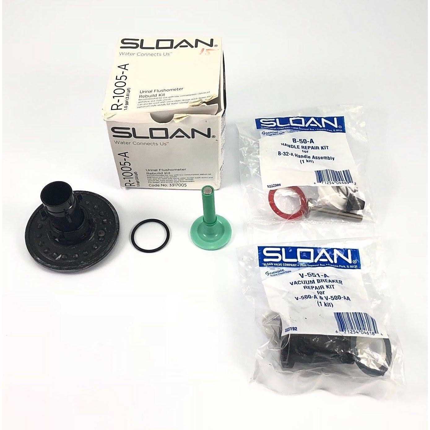 This genuine Sloan parts kit is designed to service all Sloan diaphragm type flushomters. The inside kit includes the relief valve, molded disc, diaphragm and guide assembly. Also included are the vacuum breaker kit, handle repair kit and stop tail o-ring. This kit will solve most flushometer operation problems.