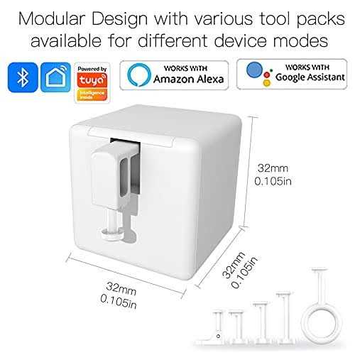 WIRELESS APP & TIMER CONTROL: You can control fingerbot controller directly via Bluetooth with Smart life/Tuya App. You can also set up the smart finger robot to turn all functions on and off according to your own schedule. Turn lights or home appliances on/off automatically even when you’re away. VOICE CONTROL & HOME AUTOMATION–NEED A GATEWAY HUB: Use a Bluetooth gateway (Not included), Compatible with Amazon Alexa and Google Assistant, you can control smart button remotely from anywhere and enable voice control. EASY TO INSTALL & SETTING UP: Tape it right next to a rocker switch or button with a 3M sticker. Easy App operation. Your old devices can be retrofitted in seconds with no swapping, no tools are required. HIGH COMPATIBILITY: Fingerbot comes with 5 Tool arms, can suit various scenarios, including rocker switches,toggle switches, buttons, and more to discover. Support click and press modes; Support both forward and reverse operation modes.The amplitude can be adjusted, support two modes of rising and falling. Whether an old garage door, lamp switch, fans, doorbell or a coffee maker, Fingerbot can help smartly control your old devices by pressing their buttons and switches. ENERGY SAVING & EXCELLENT AFTER-SALES SERVICE: Smart finger robot is powered by a replaceable battery(Including Battery), working time can last for more than one year without to replace the battery.”