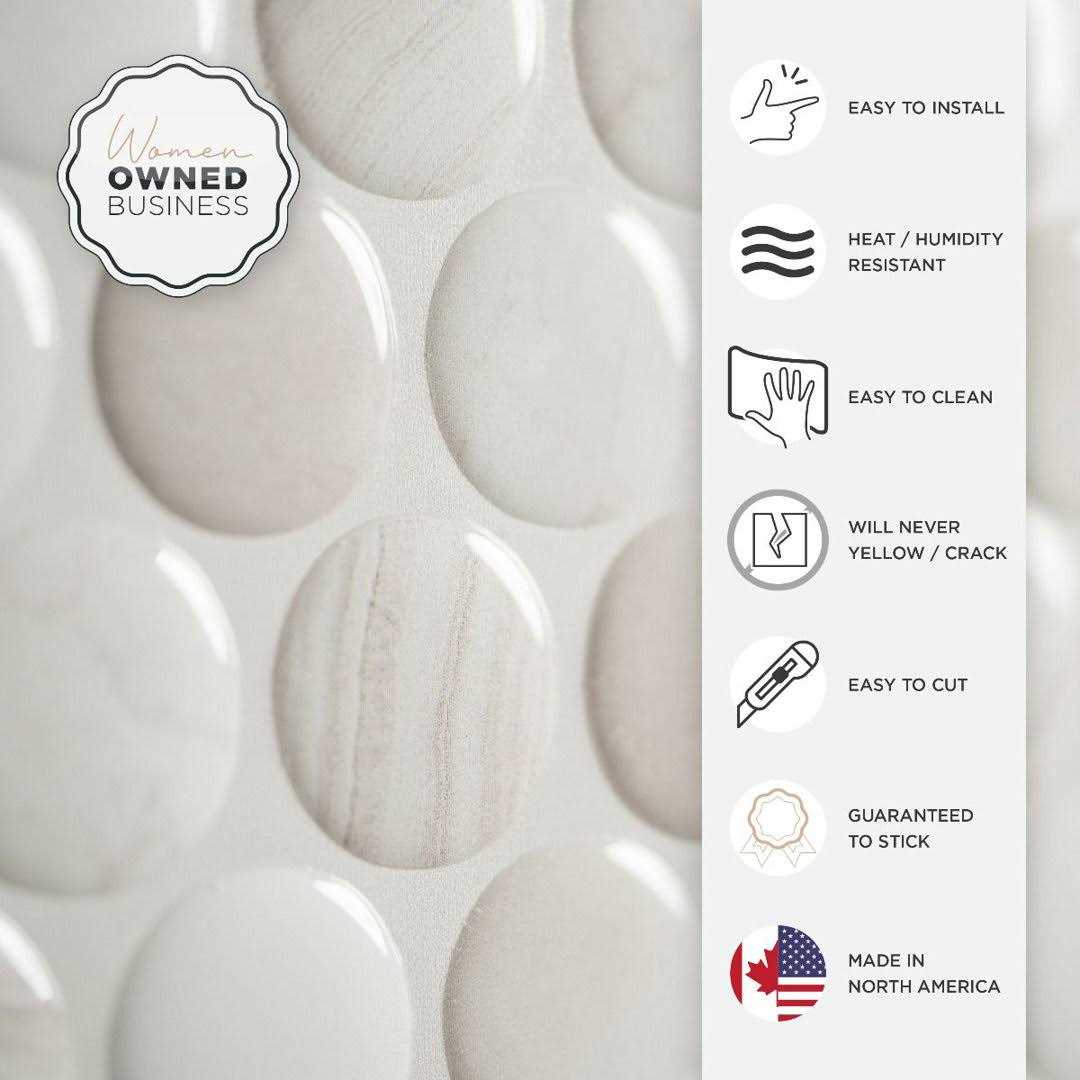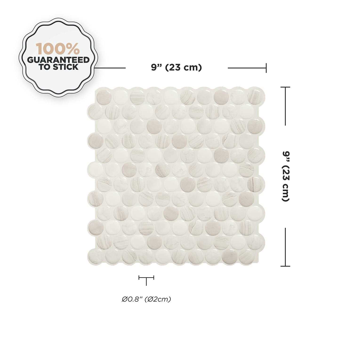 Sandy beige and white stone penny round tiles with beige/grey grout. Use this stick on tiles model in your kitchen, bathroom or laundry. This designs looks great paired with wood and soft decor. The self-adhesive design makes installation a breeze, and ensures maximum durability when applied correctly. Get creative with the design possibilities and watch your space come to life.