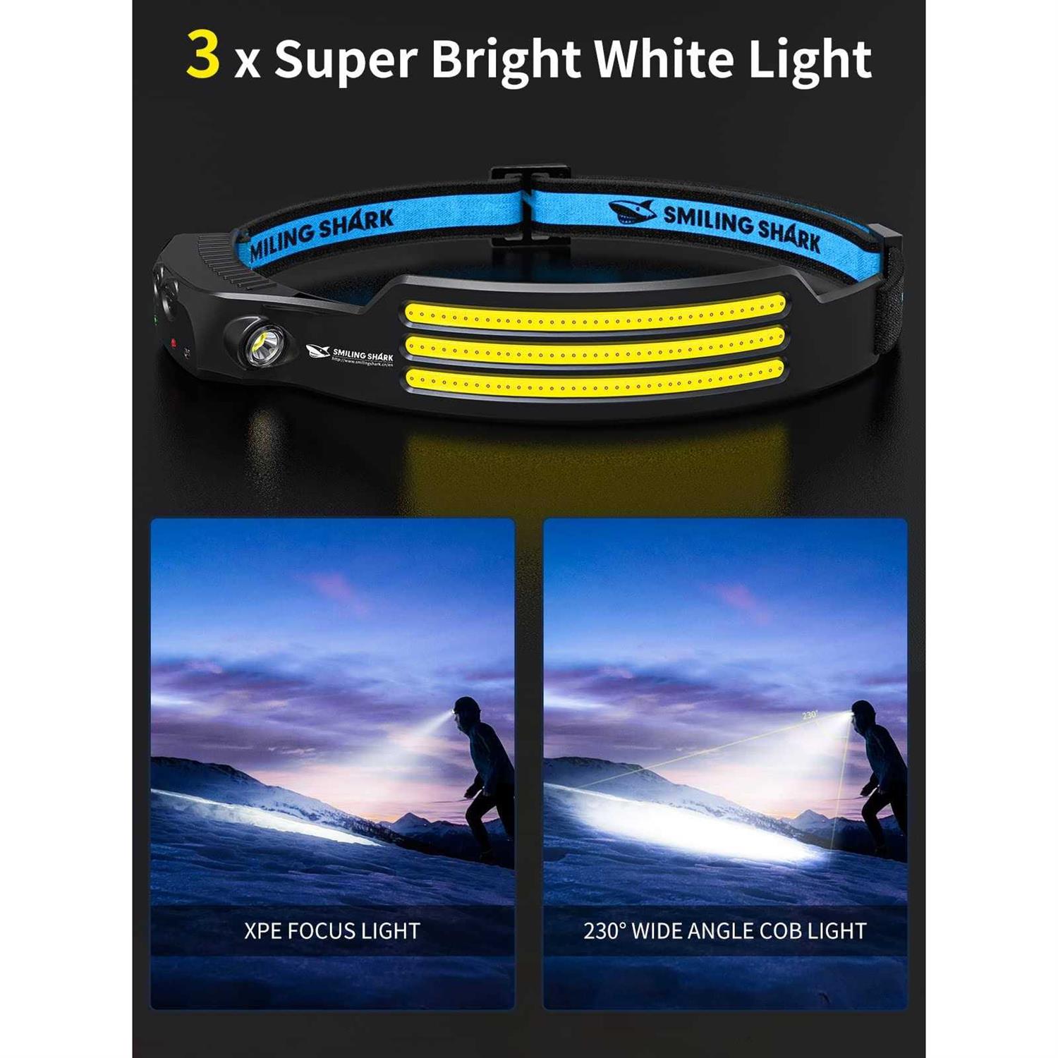 Smiling Shark LED Headlamp 230°Wide Angle 3 Light Strips The Brightest Head Lamp Rechargeable with Motion Sensor Waterproof Headlight