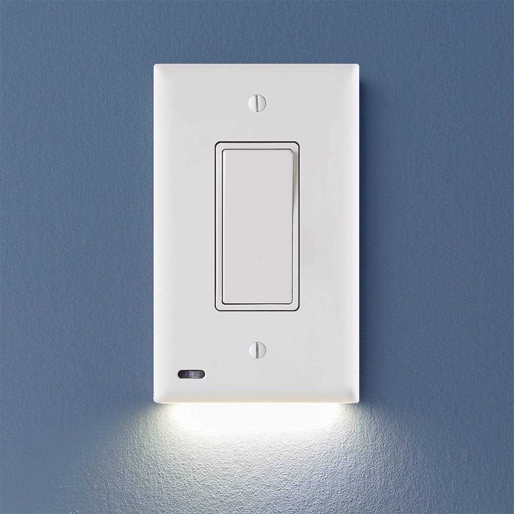 SwitchLight is a light switch cover plate with built-in LED lights that are activated by an automatic on/off sensor. It provides beautiful accent, pathway, and night lighting for your home, and makes it easy to spot your light switches in the dark, no matter how sleepy and disoriented you may be! SwitchLight is perfect for hallways, bathrooms, kitchens, and more. Its LED lights provide up to 25 years of reliable illumination, and it includes a switch to easily toggle between bright, dim and off settings. NOTE: This SwitchLight is designed for 3-way light switches, where two light switches control the same overhead lights. It also works on standard single-pole switches.