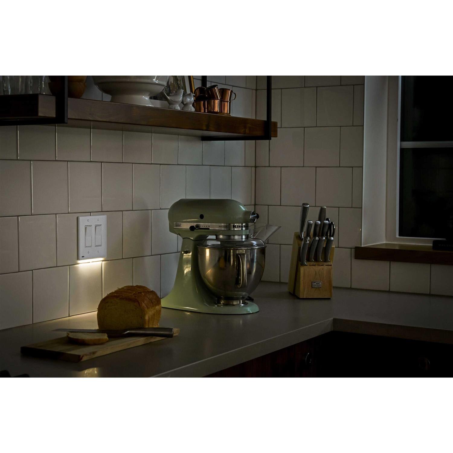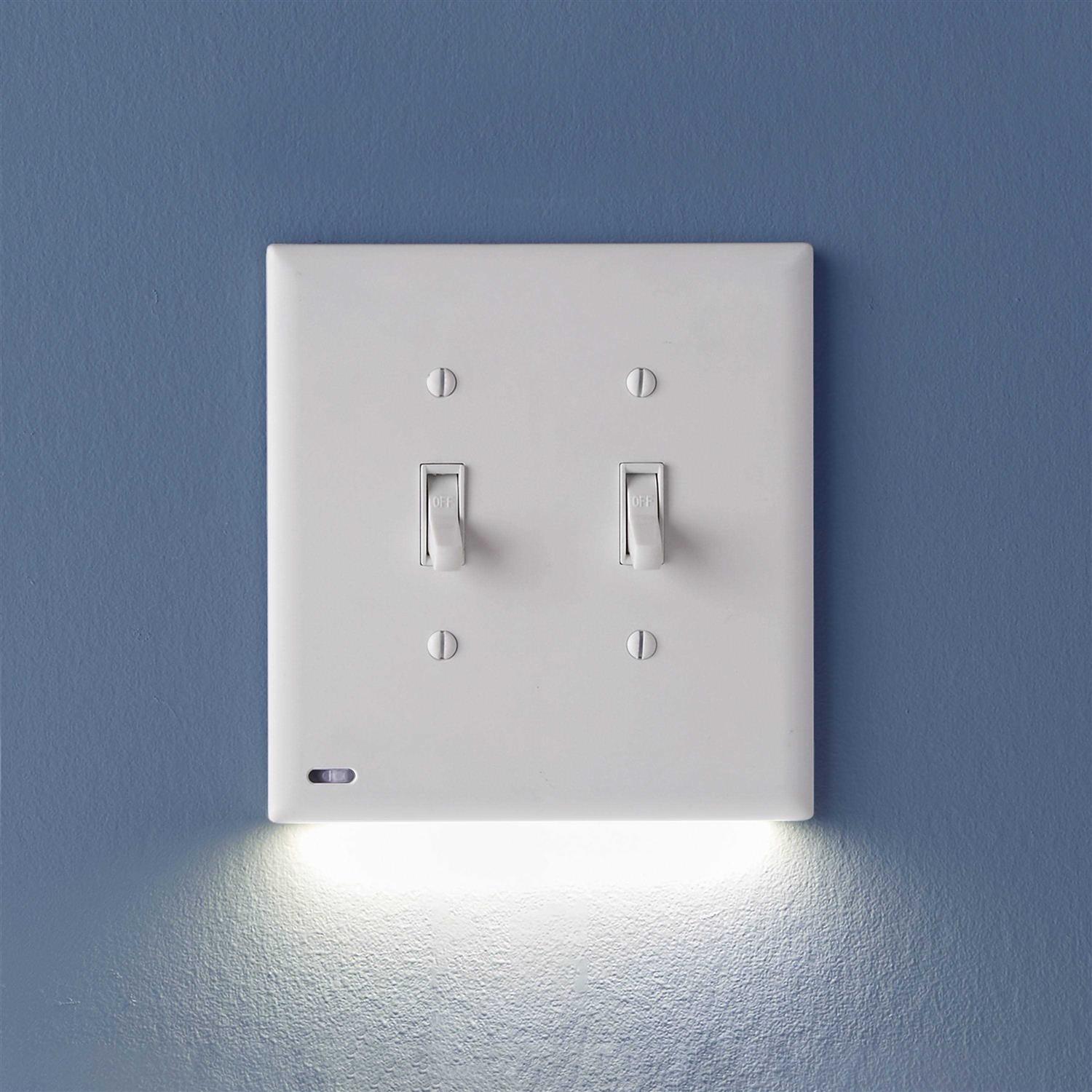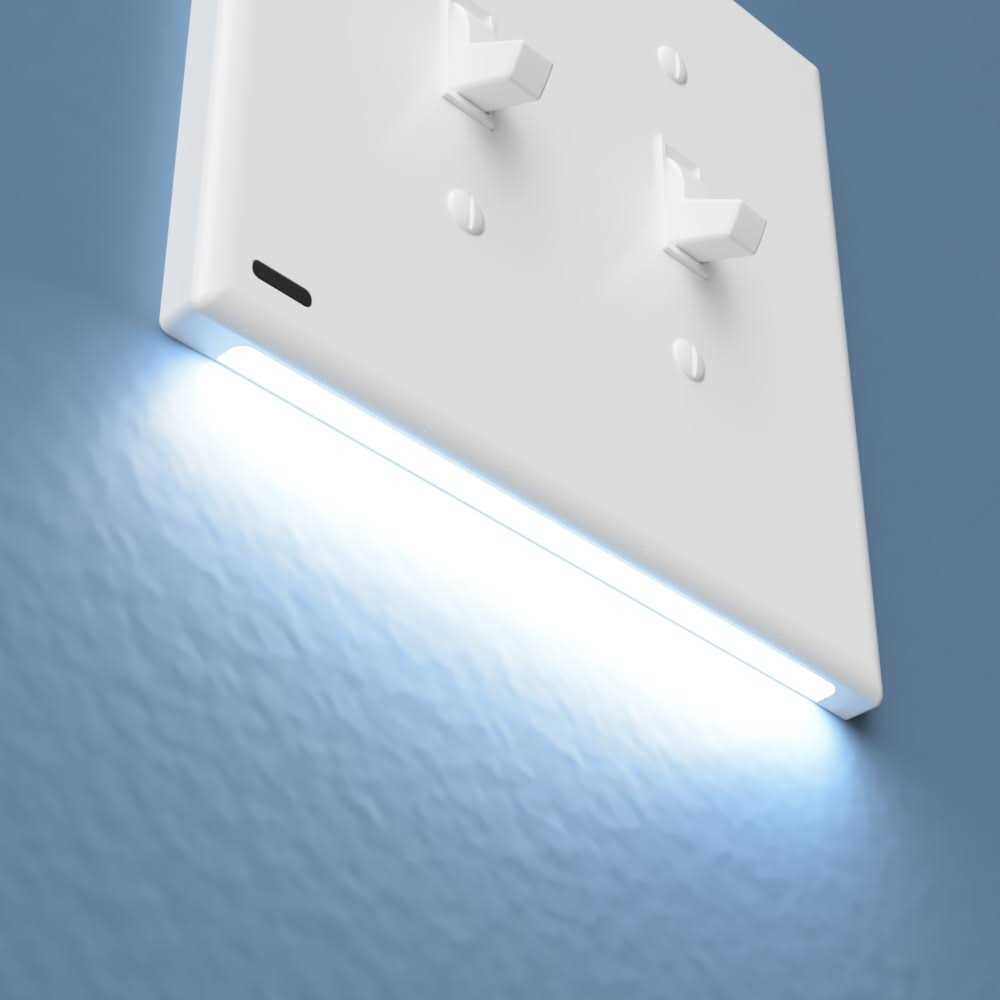 SwitchLight is a light switch cover plate with built-in LED lights that are activated by an automatic on/off sensor. It provides beautiful accent, pathway, and night lighting for your home, and makes it easy to spot your light switches in the dark, no matter how sleepy and disoriented you may be! SwitchLight is perfect for hallways, bathrooms, kitchens, and more. Its LED lights provide up to 25 years of reliable illumination, and it includes a switch to easily toggle between bright, dim and off settings. FEATURES Compatible with all standard triple gang light switches. Works on 3-way switches where multiple switches control the same set of overhead lights.