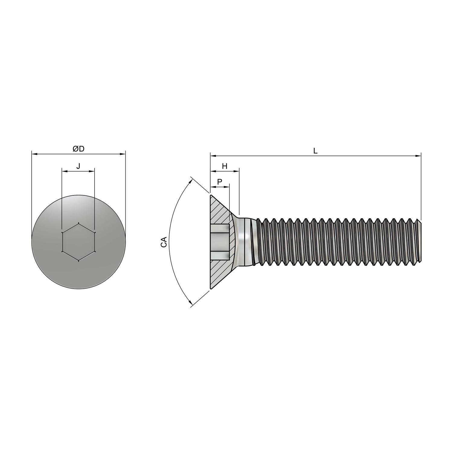 The M4 X 20mm Socket Countersunk Screws (DIN 7991) – High Tensile Steel (10.9) has the following features:1.8mm Hexagon Depth , DIN 7991 Manufacturing Standard, 20mm Overall Length (L), High Tensile Steel (10.9) Material, High Tensile Steel (10.9) Material Specification, 0.7mm Screw Thread Pitch, Natural Finish, Metric Metric or Imperial?, M4 (4mm) Thread Size, 8mm Head Diameter (D), +0/-0.36mm Head Diameter (D) Tolerance, 90 degrees Countersunk Angle (CA), 2.3mm Countersunk Length (Max) (H), 2.5mm Socket Size (J), /p/35-stainless-steels Material Link, /p/438-natural-finish Finish Link. Discover more about the Metric Socket Countersunk Screws range. Countersunk Socket Head Screws feature a countersunk head type, which allows them to sit flush with their target housing. The socket head of these screws makes them ideal for use alongside Accu’s Hex Drive Bits or Allen Keys & Wrenches. Countersunk Screws are designed to be used alongside pre-drilled countersunk recesses, which can be made with the use of angle cutters called countersinks. Countersunk Captive Fasteners Captive screw variants of Accu’s Metric Countersunk Screws are available in A2 and A4 Stainless Steel, with other materials such as thermoplastic PEEK available on request. Our range of Socket Countersunk Captive Screws are designed to be used in conjunction with Captive Washers to prevent the screws from falling out of housing assemblies and conform to EU Safety regulations. Materials Countersunk Socket Head Screws can be manufactured from a range of materials, including A2, A4 and Bumax Stainless Steel options as standard. Accu also supplies Socket Countersunk Screws in 10.9 and 12.9 High Tensile Steel, with materials such as Titanium, Aluminium and PEEK available through our custom manufacture service. Chemical Blackening is available on Stainless Steel screws, with Thread Locking Patches and various other finishes also available on request. Security Screw Variant For applications requiring a tamper-proof drive, this component is also available in a security variant, which can be found in Accu’s Security Socket Countersunk Screws range. Metric Sizes Accu’s Metric Socket Countersunk Screws are available in thread sizes ranging from M2 to M24, and lengths from 3mm up to 200mm. Imperial Sizes Imperial Countersunk Socket Screws are also available in diameters from #0 to 7/8 inch. Lengths are available from 1/8 inch up to 10 inches. Minimum Thread Length