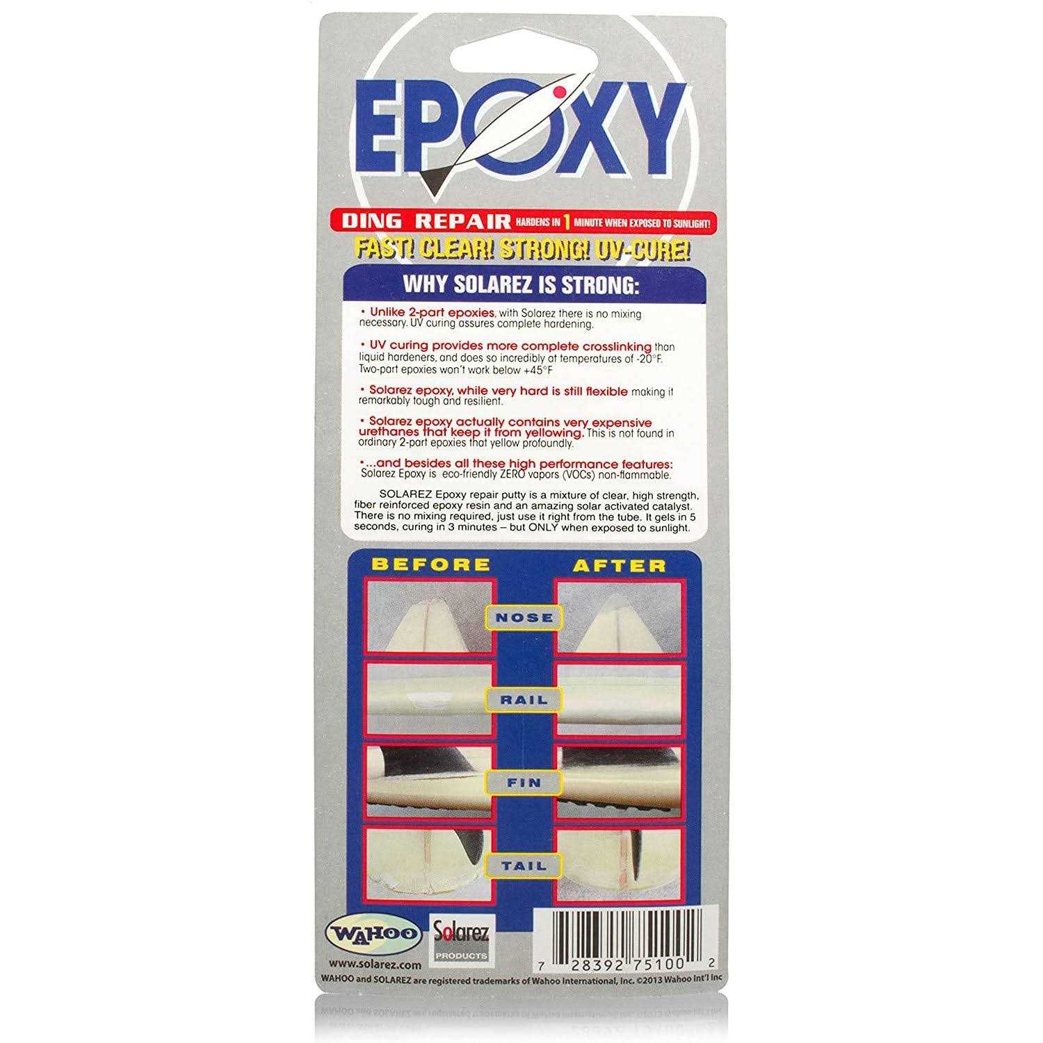 Includes Solarez UV Cure Epoxy Resin & 60/240 Grit Sand Pad No mixing necessary. UV curing assues complete hardening. Provides complete crosslinking; Remarkably tough and resilient Contains urethanes that keep from yellowing; Eco-friendly Zero vapors, non-flammable These resins cure exceptionally dry unlike other UV cure resins that cure tacky. Solarez UV Cure Epoxy Ding Resin repair putty is a mixture of clear, high strength, fiber reinforced epoxy resin and an amazing solar activated cataylst. There is no mixing required, just use it right from the tube. It gels in 5 seconds, curing in 3 minutes – but ONLY when exposed to sunlight. No mixing necessary. UV curing assues complete hardening. Provides complete crosslinking Remarkably tough and resilient Contains urethanes that keep from yellowing Eco-freindly ZERO vapors, non-flammable. Comes with 60/240 grit sand pad.