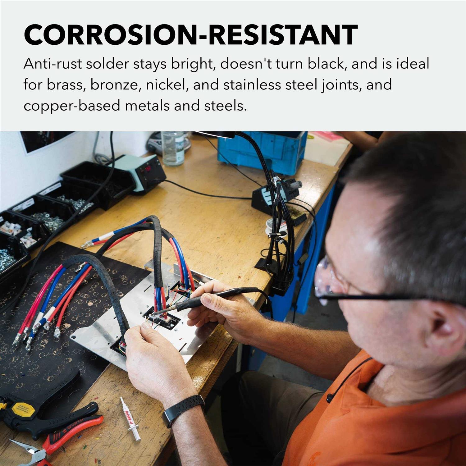 No mess, no waste, 7.1 gram syringe. Works with the heat of a match or lighter. Works on ferrous and non-ferrous metals. Five times stronger than conventional solders. Offers tensile strength of 10,000-28,000 psi. Flows freely and smoothly between 395-430 degrees Farenheit. Remelts at 500 degrees Farenheit. Convenient application, strong performance, versatile usage. Use for all electrical soldering wires, connectors, cables, copper piping, home plumbing and car radiators. Solder-It is fast, easy to apply, provides strength without the distortion of high temperature brazing, gives superiour electrical conductivity and is stress and vibration resistant.